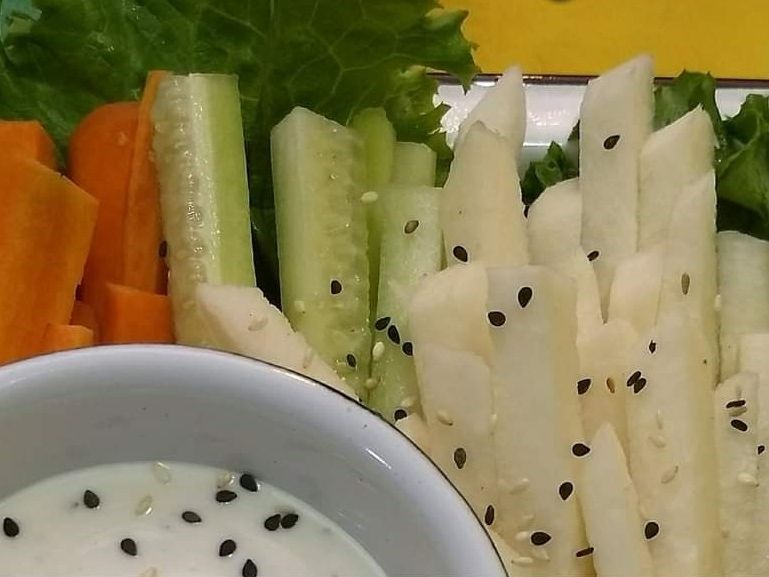 Bastones de Jícama, pepino, apio, zanahoria. Aderezo a elegir.