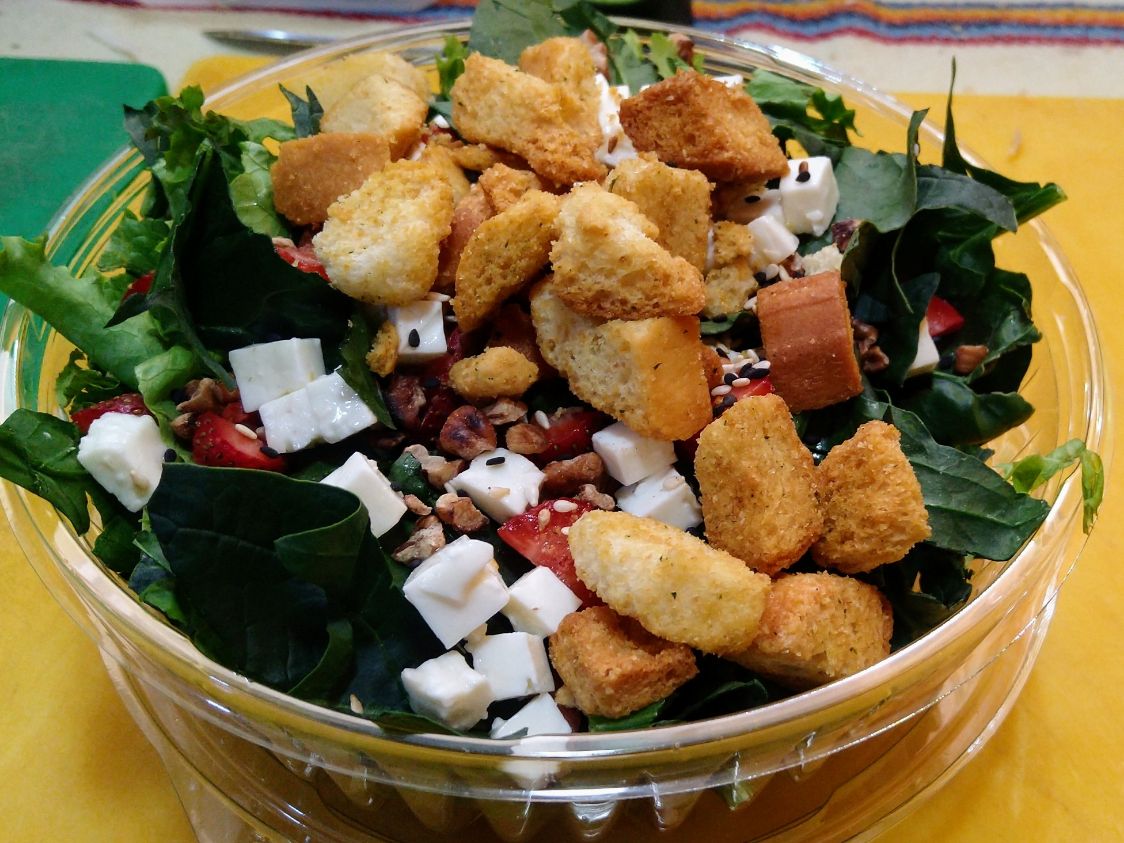 Lechuga Italiana, espinaca, fresas, queso panela, nuez pecana tostada. Toque de ajonjolí tostado, croutones, aderezo a elegir.