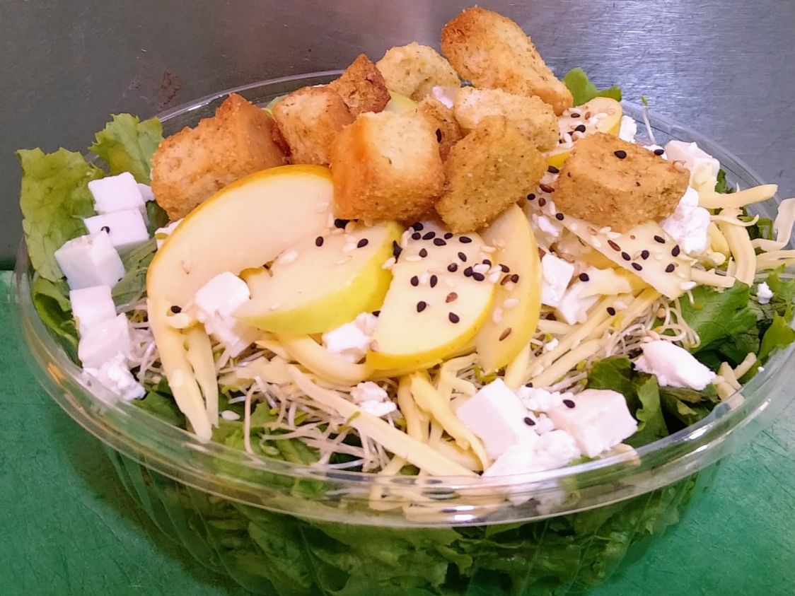 Lechuga Italiana, germen de alfalfa, queso manchego, panela, cabra, láminas de manzana. Toque de ajonjolí tostado, croutones, aderezo a elegir.