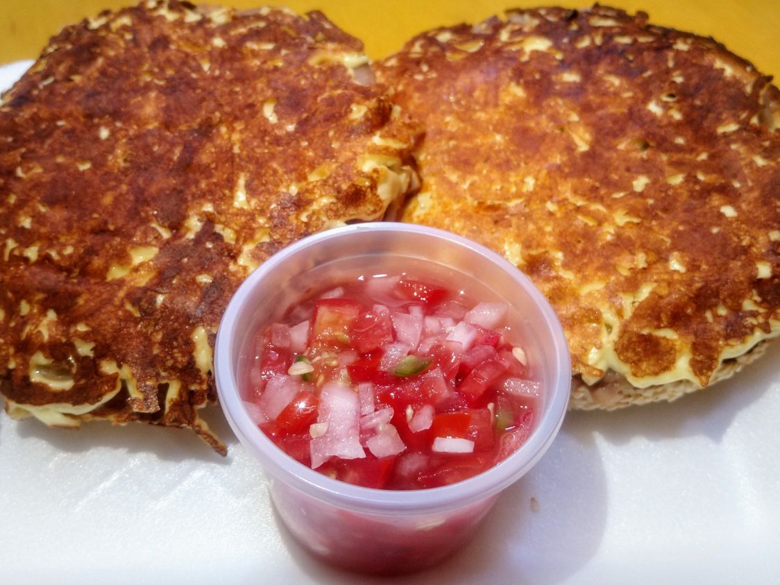 Pan bagel, frijoles, queso gratinado. Acompañados de salsa mexicana, chipotle, chiles en vinagre o habanero.