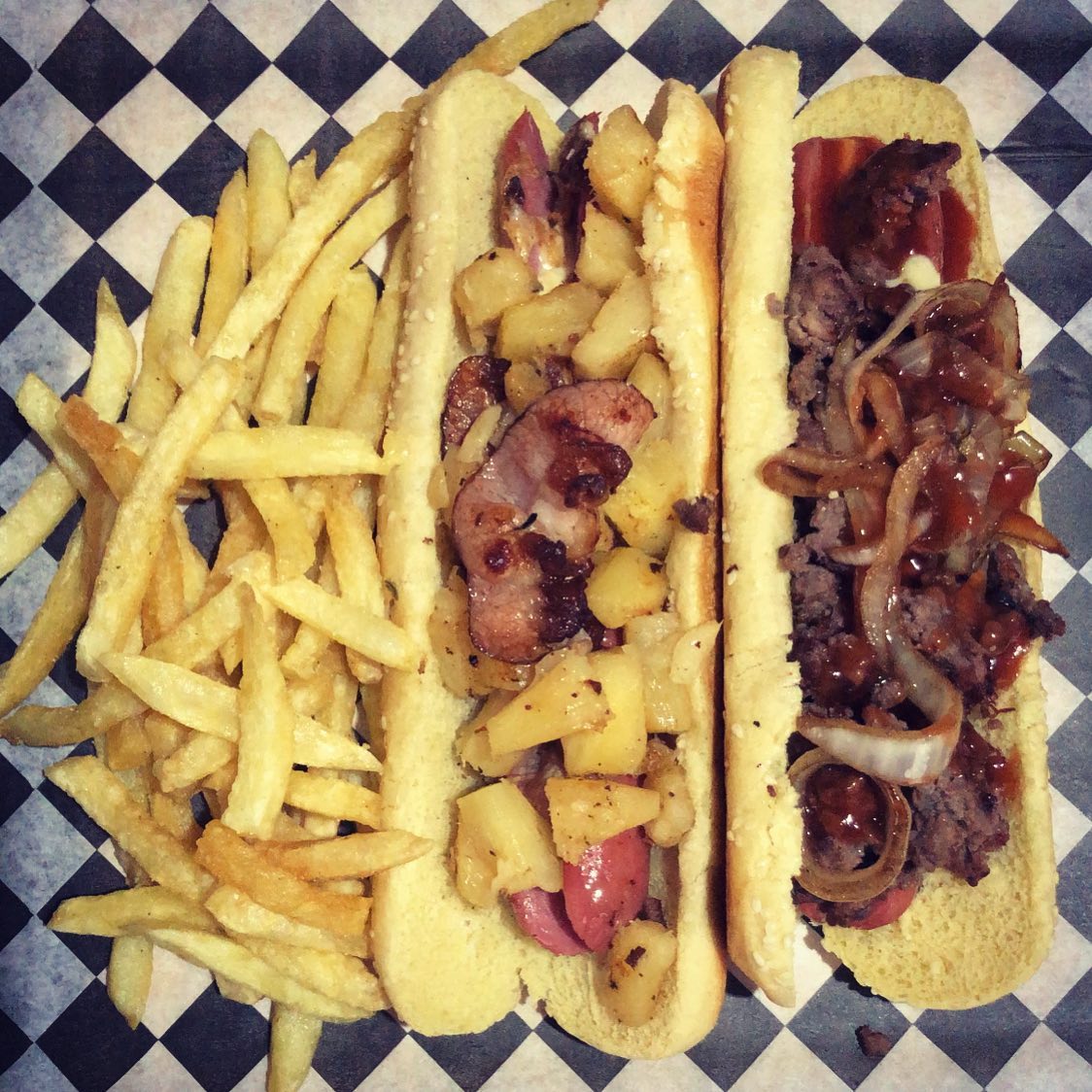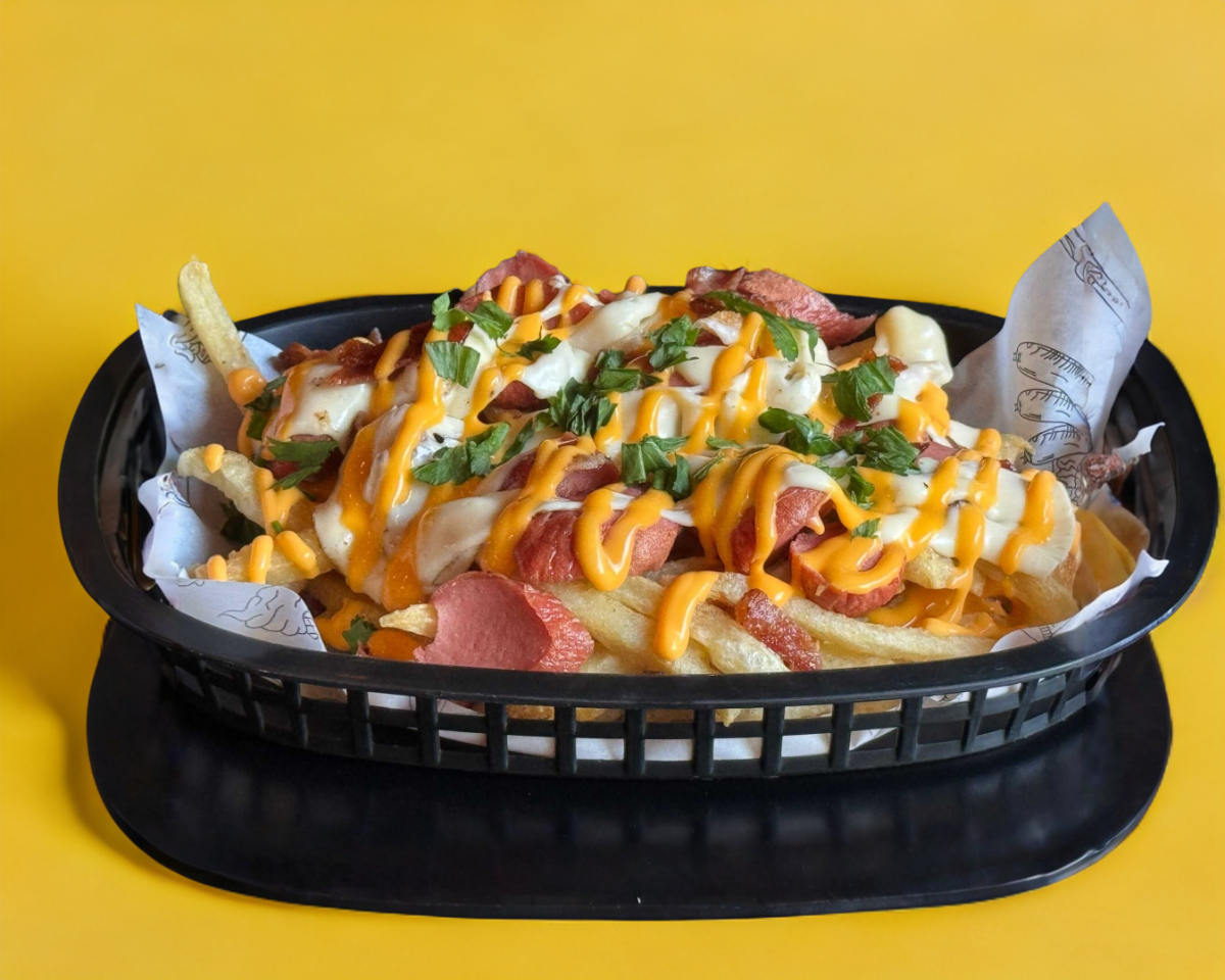 Carne de res (100 gr), queso Oaxaca, queso amarillo, jamón, salchicha, cebolla caramelizada y salsa BBQ. Acompañada con papas a la francesa.