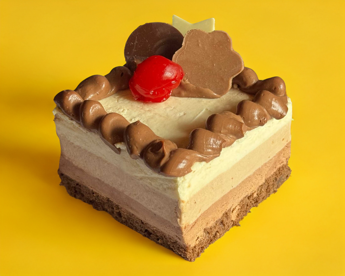 Pastel con base de bizcocho y capas de mousse que combina tres tipos de chocolate: blanco, de leche y oscuro. ¡prepárate para un torbellino de felicidad!