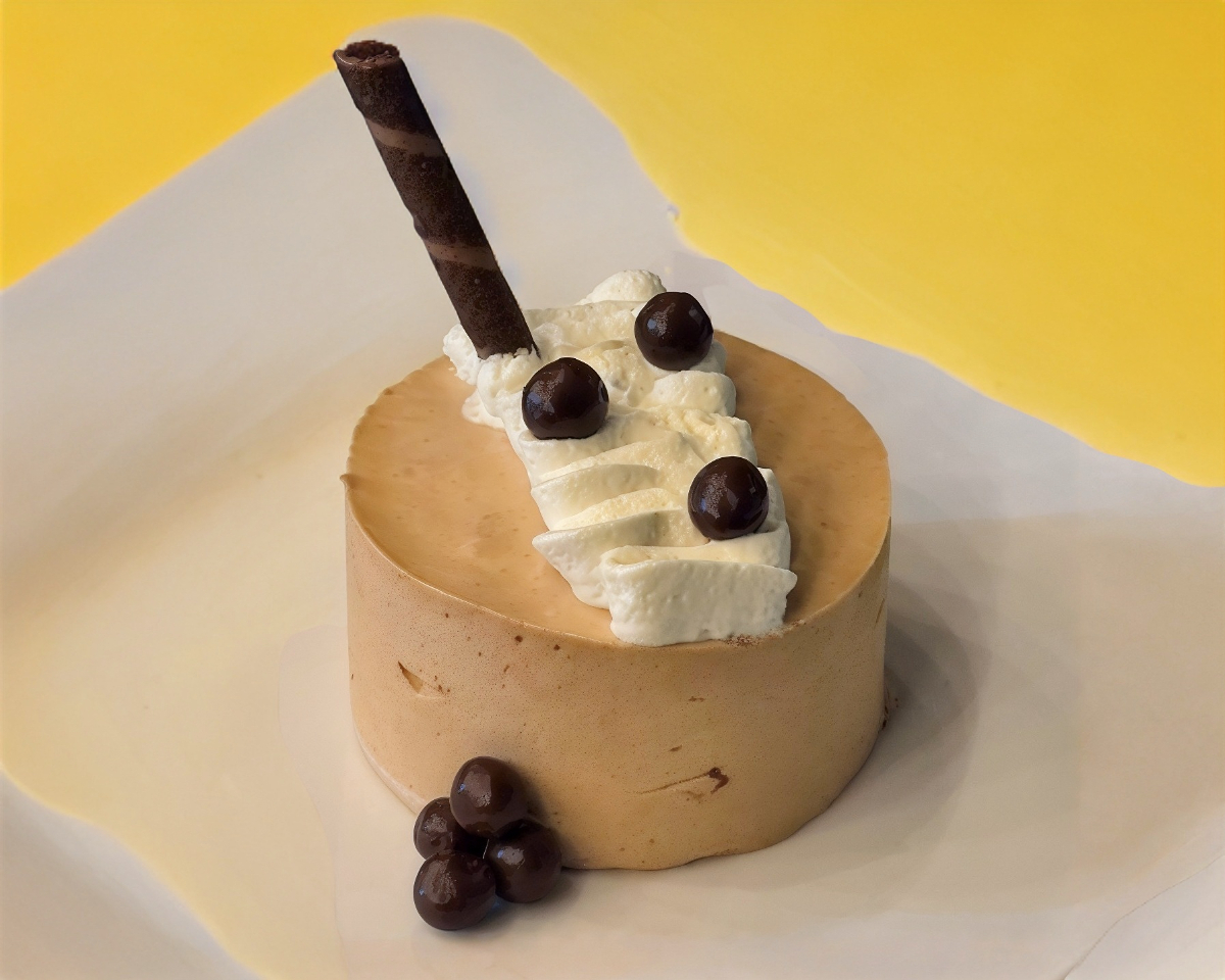 Mousse de café con geleé de chocolate, decorado con trufa de chocolate blanco y granos de café.