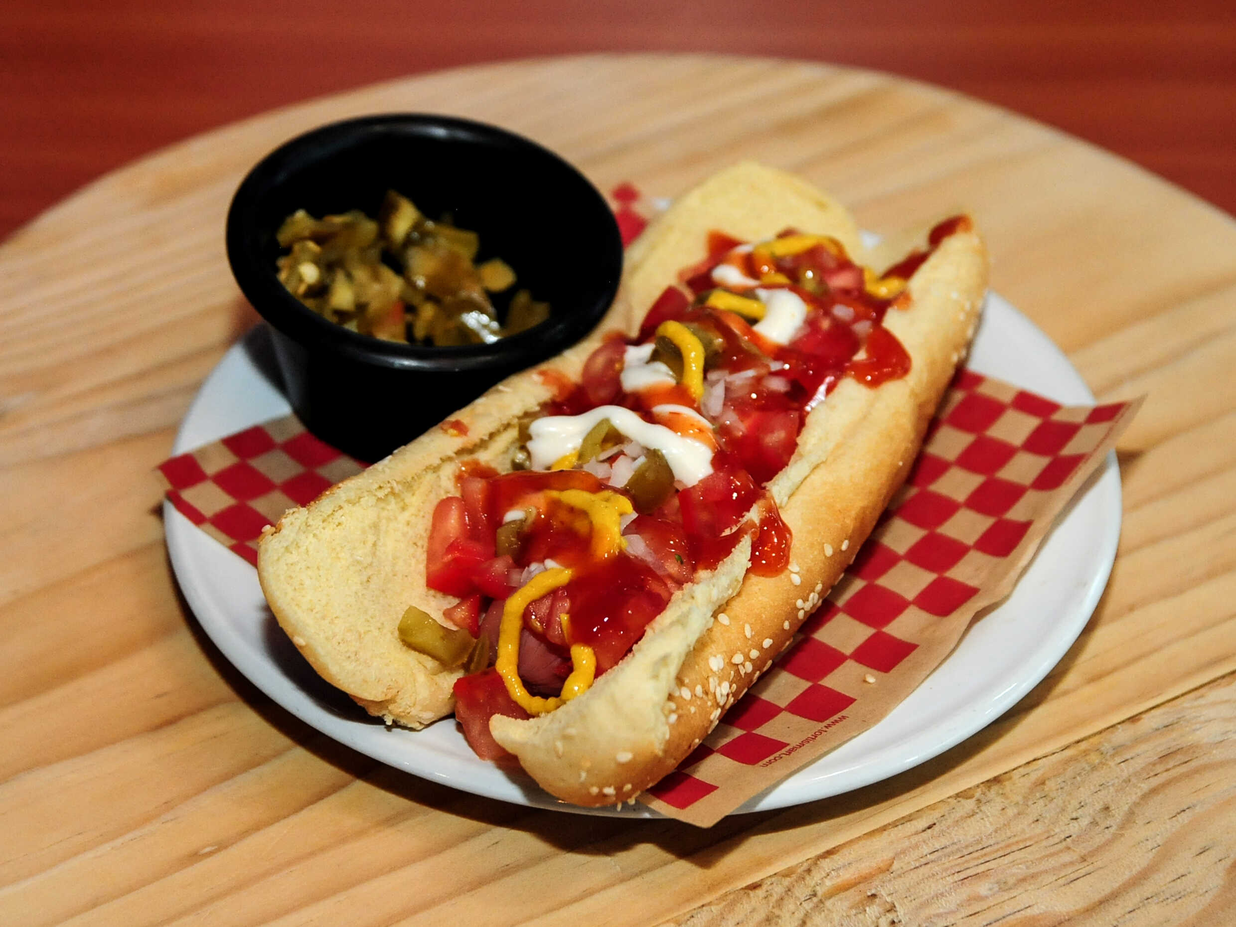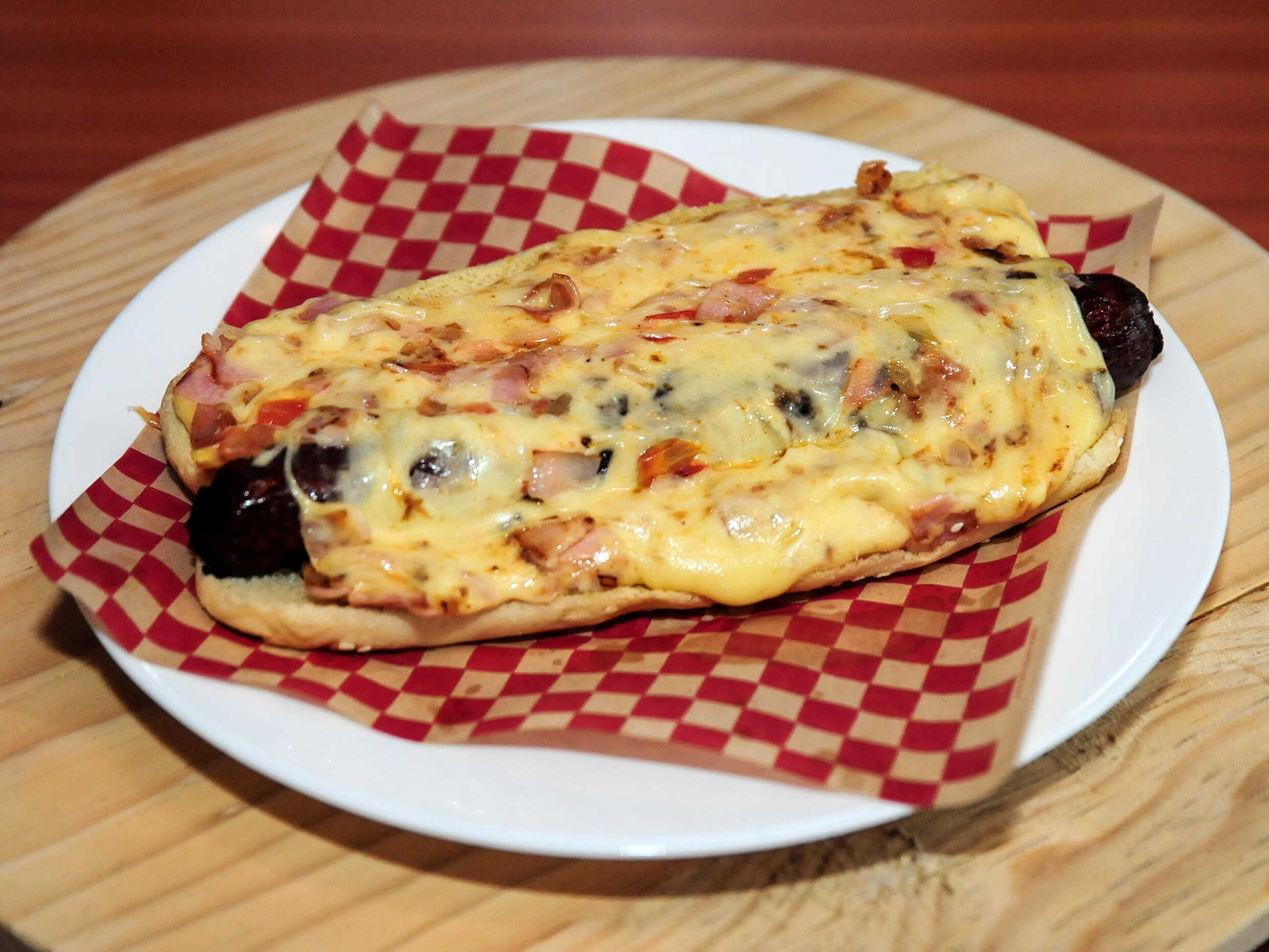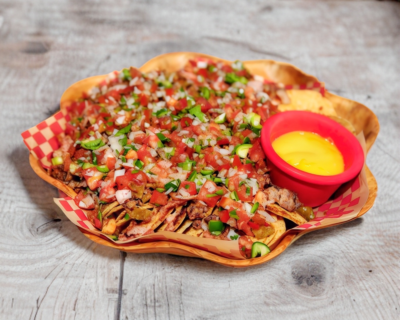 Queso, salchicha, tocino, salsa BBQ y chiles jalapeños