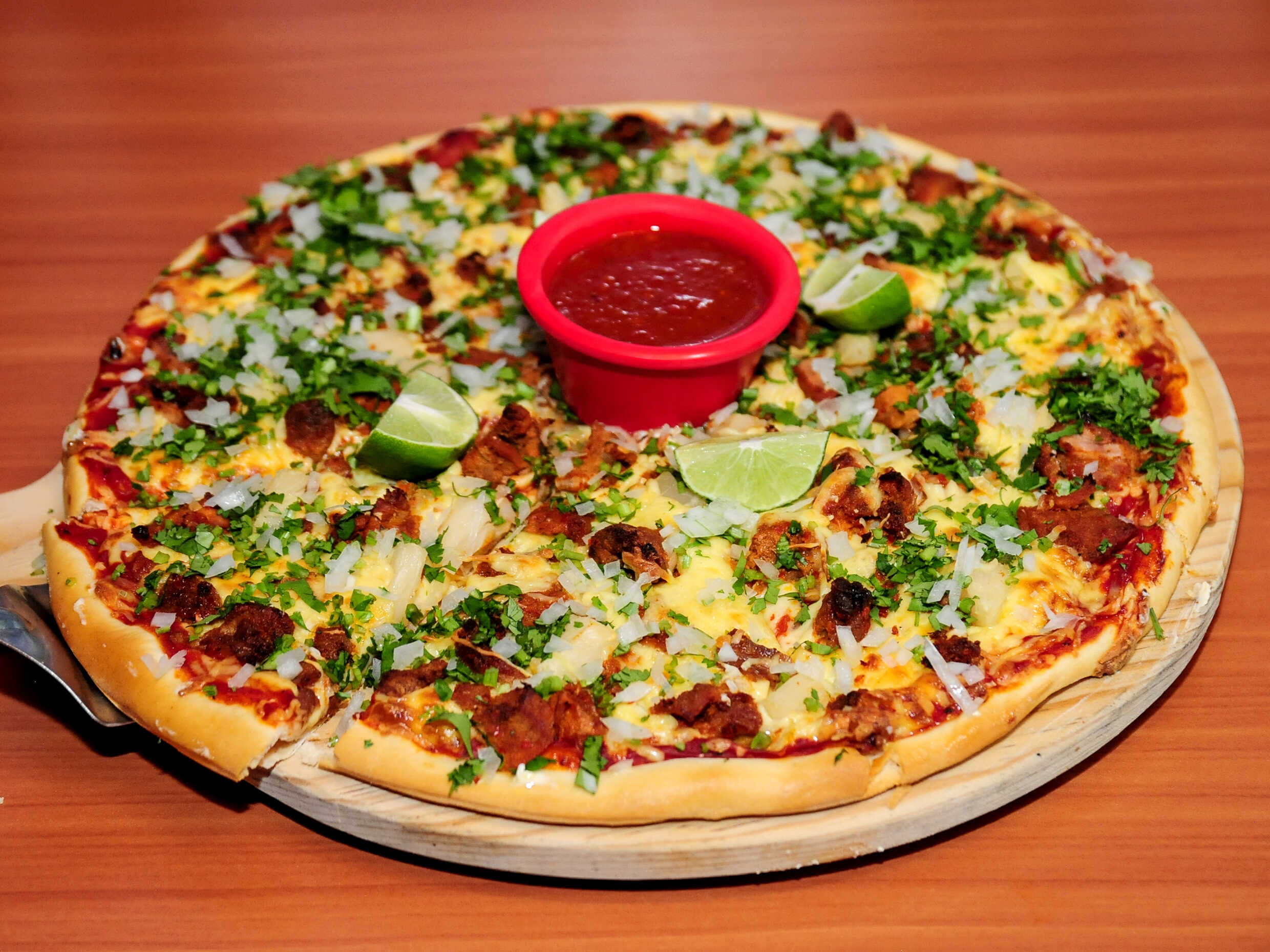 Queso, tocino, salchicha jumbo, piña, cebolla, jitomate y chiles jalapeños