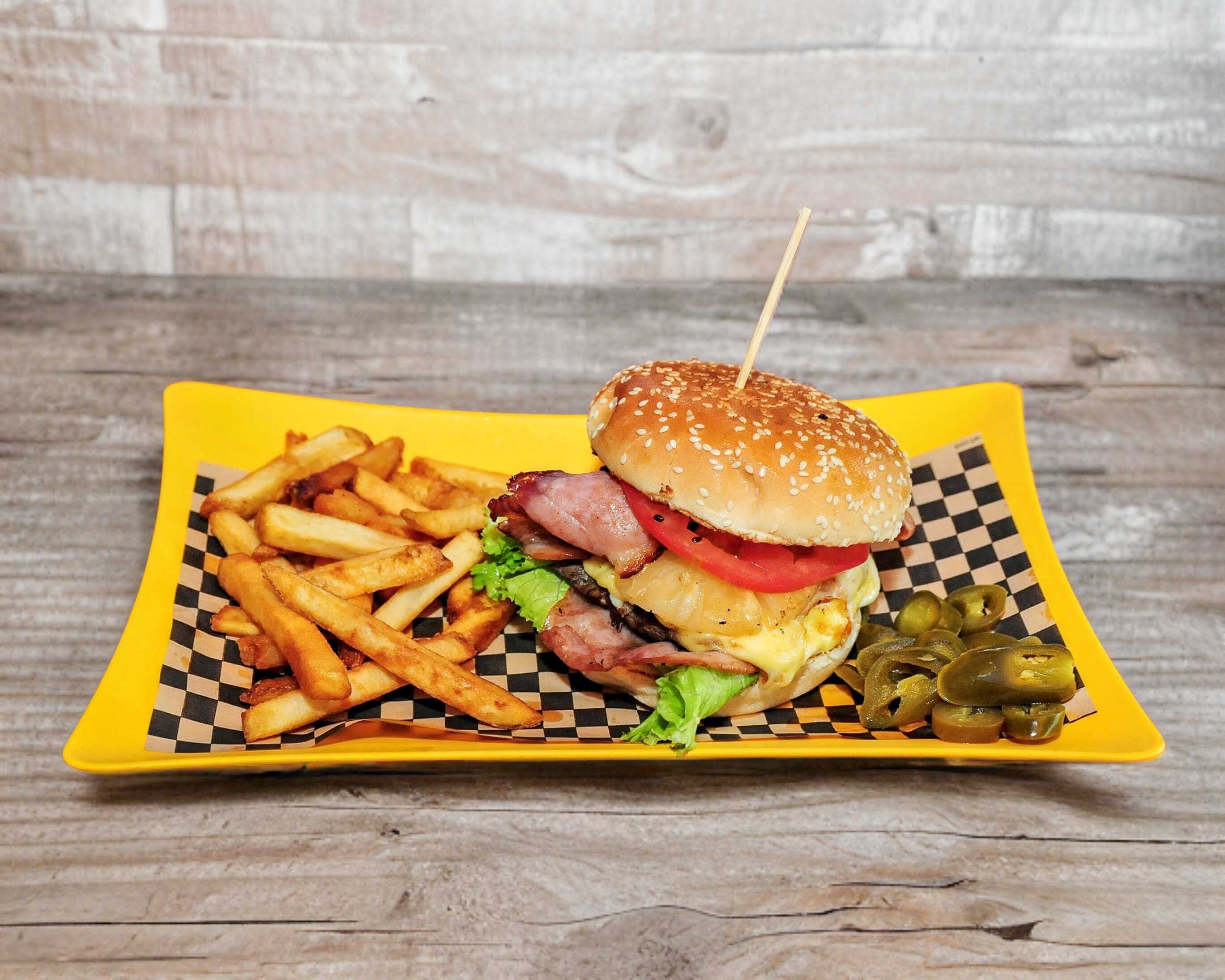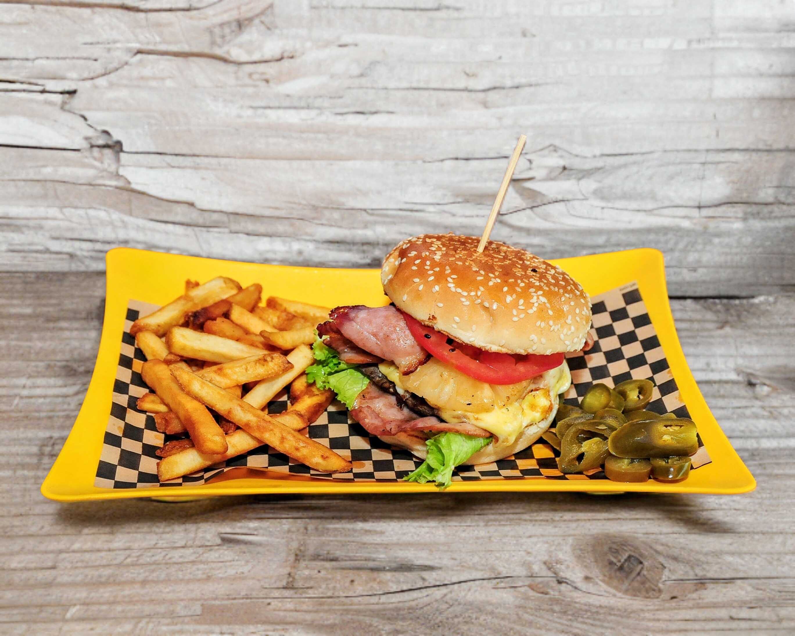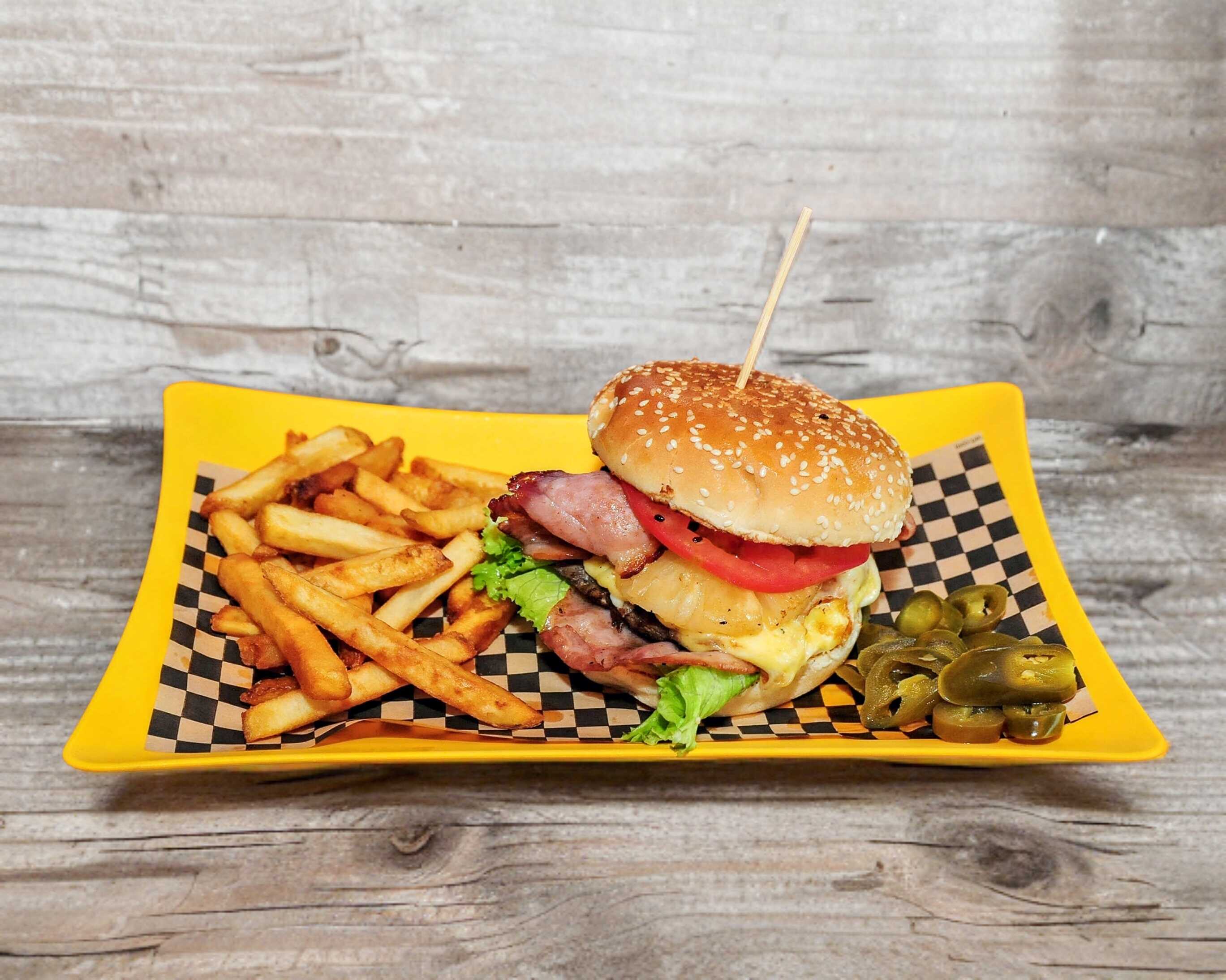 Carne de res, queso lechuga italiana, jitomate, cebolla y pan sazonado en mantequilla, incluye papas a la francesa