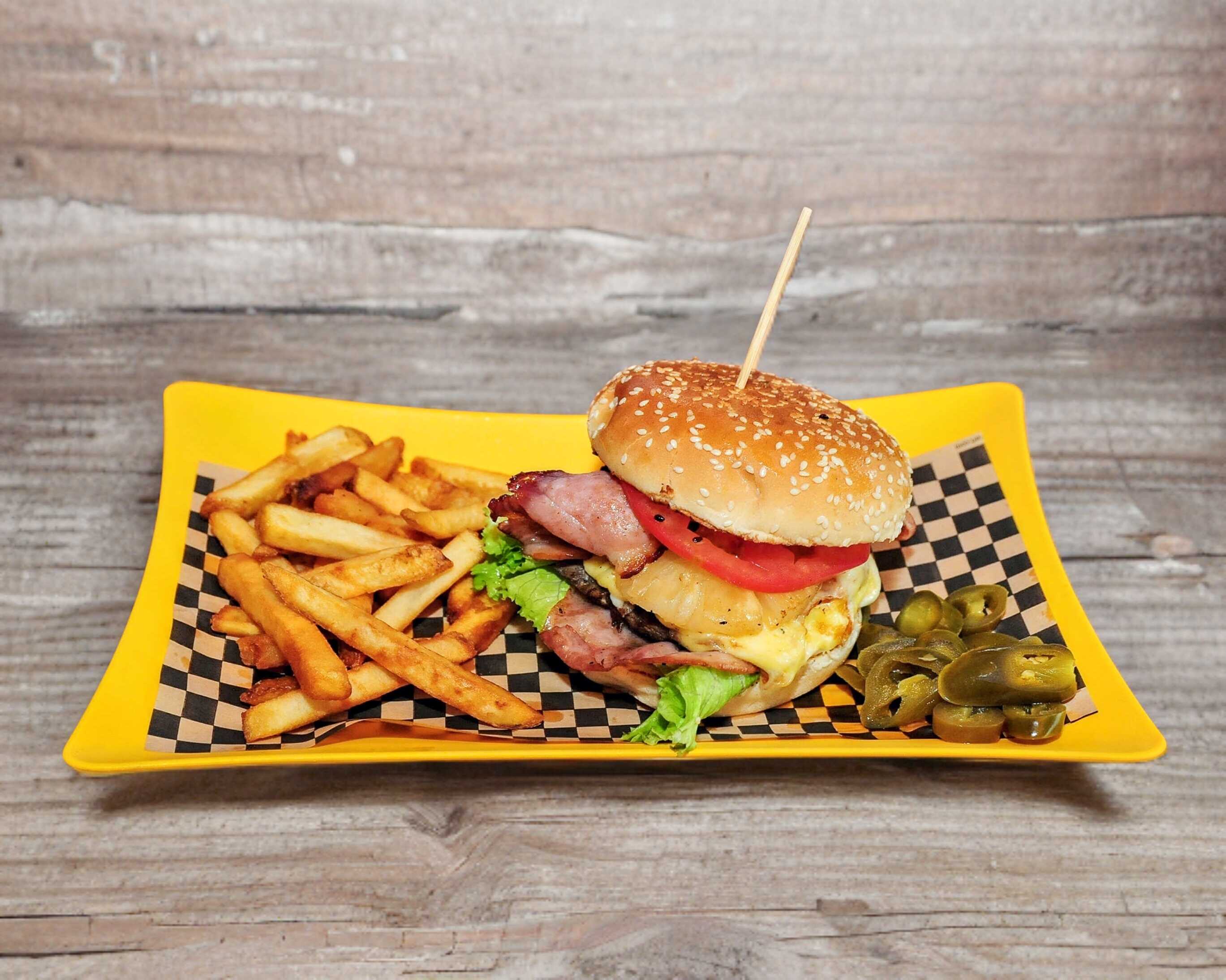 Arrachera, queso, tocino, lechuga italiana, jitomate y cebolla, incluye papas a la francesa