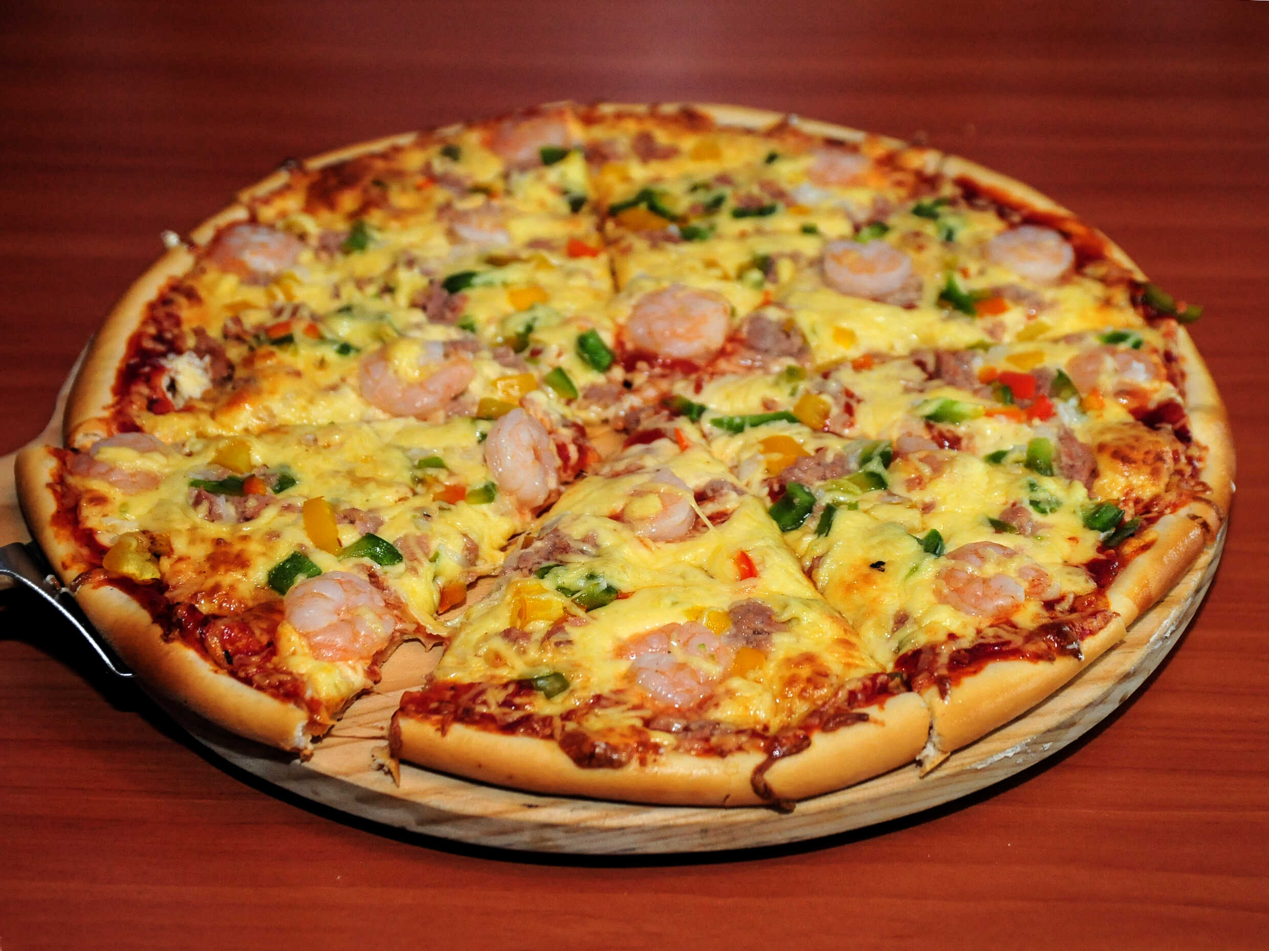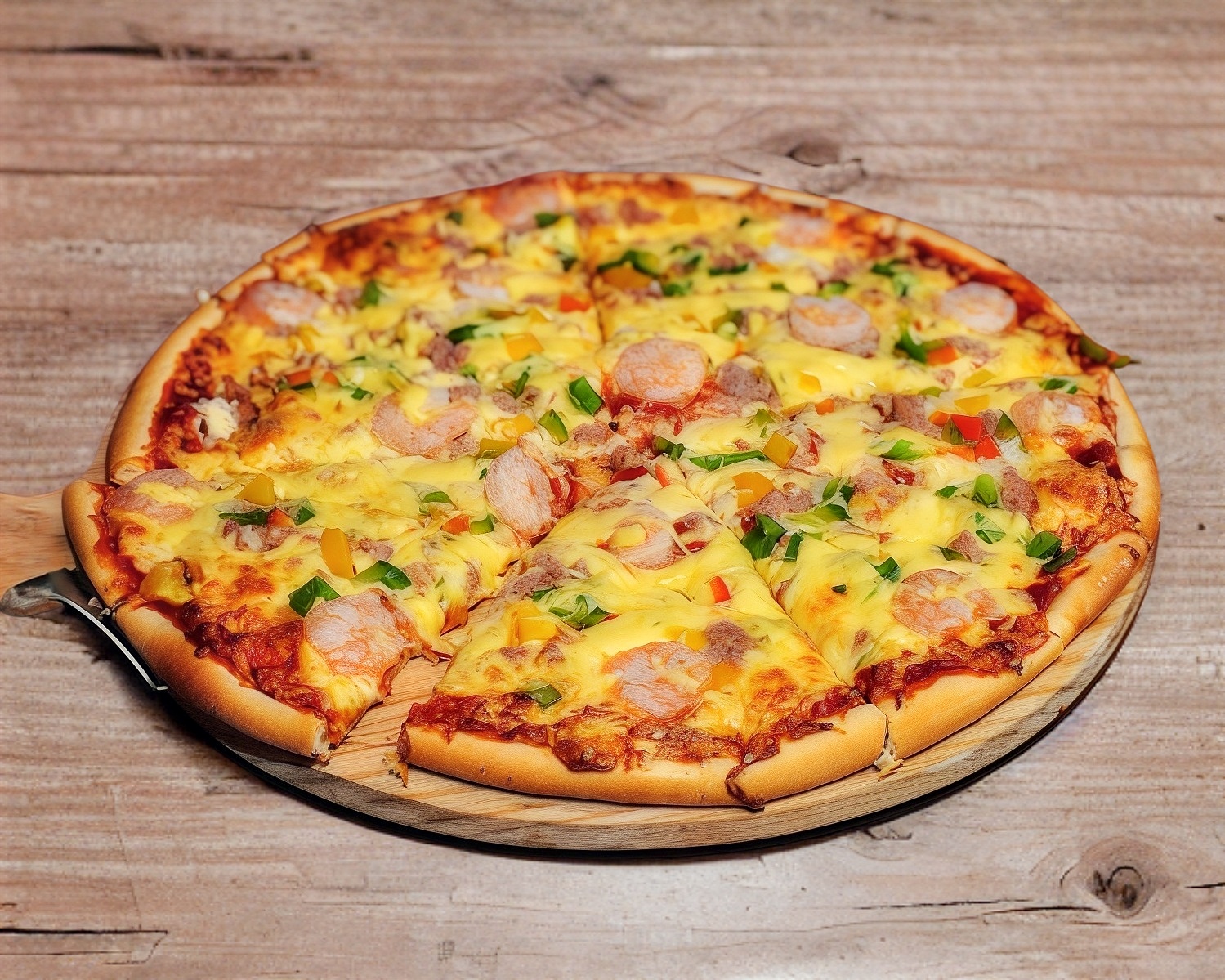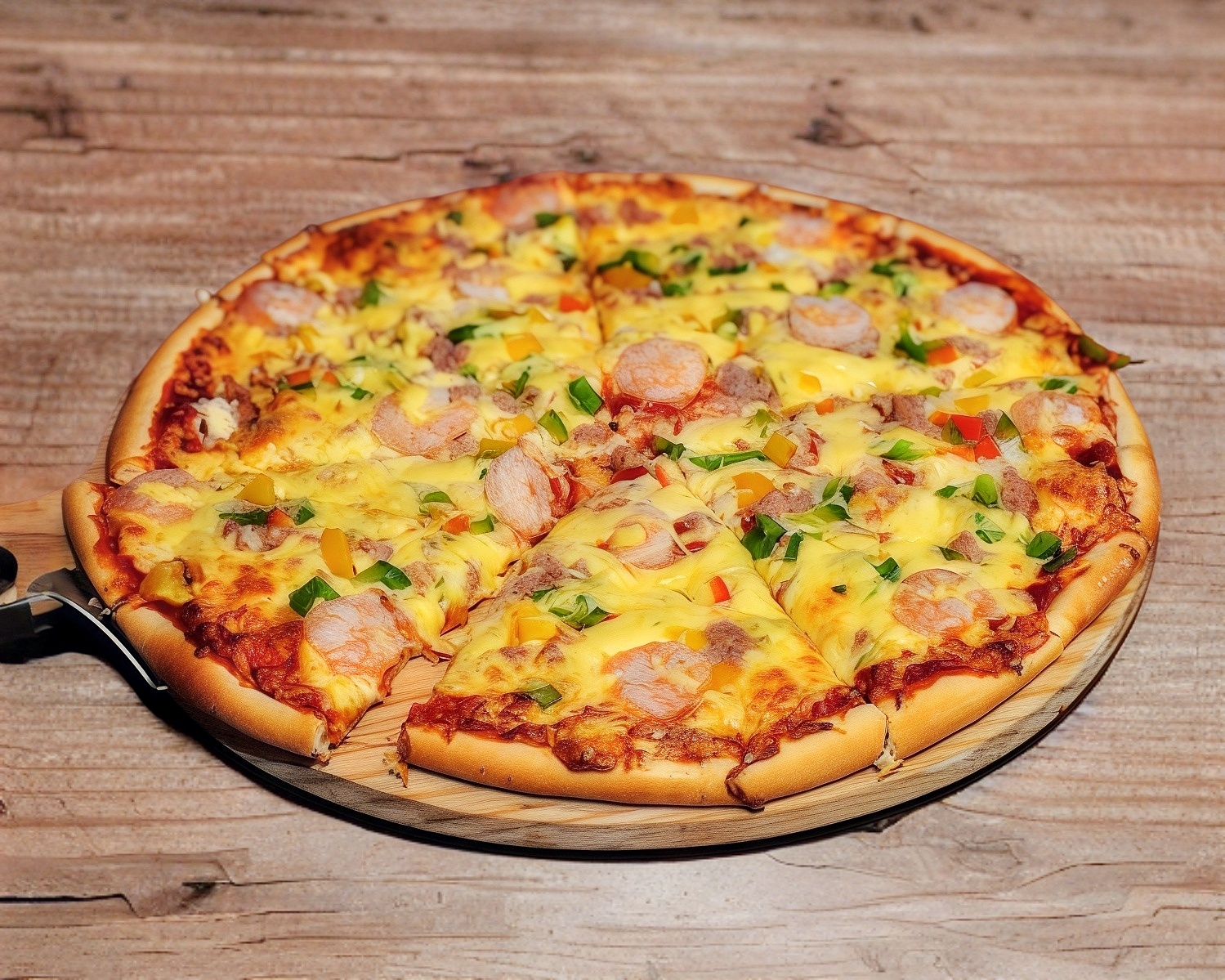 Queso, salchicha, piña, pimiento, jamón, champiñones y chiles jalapeños