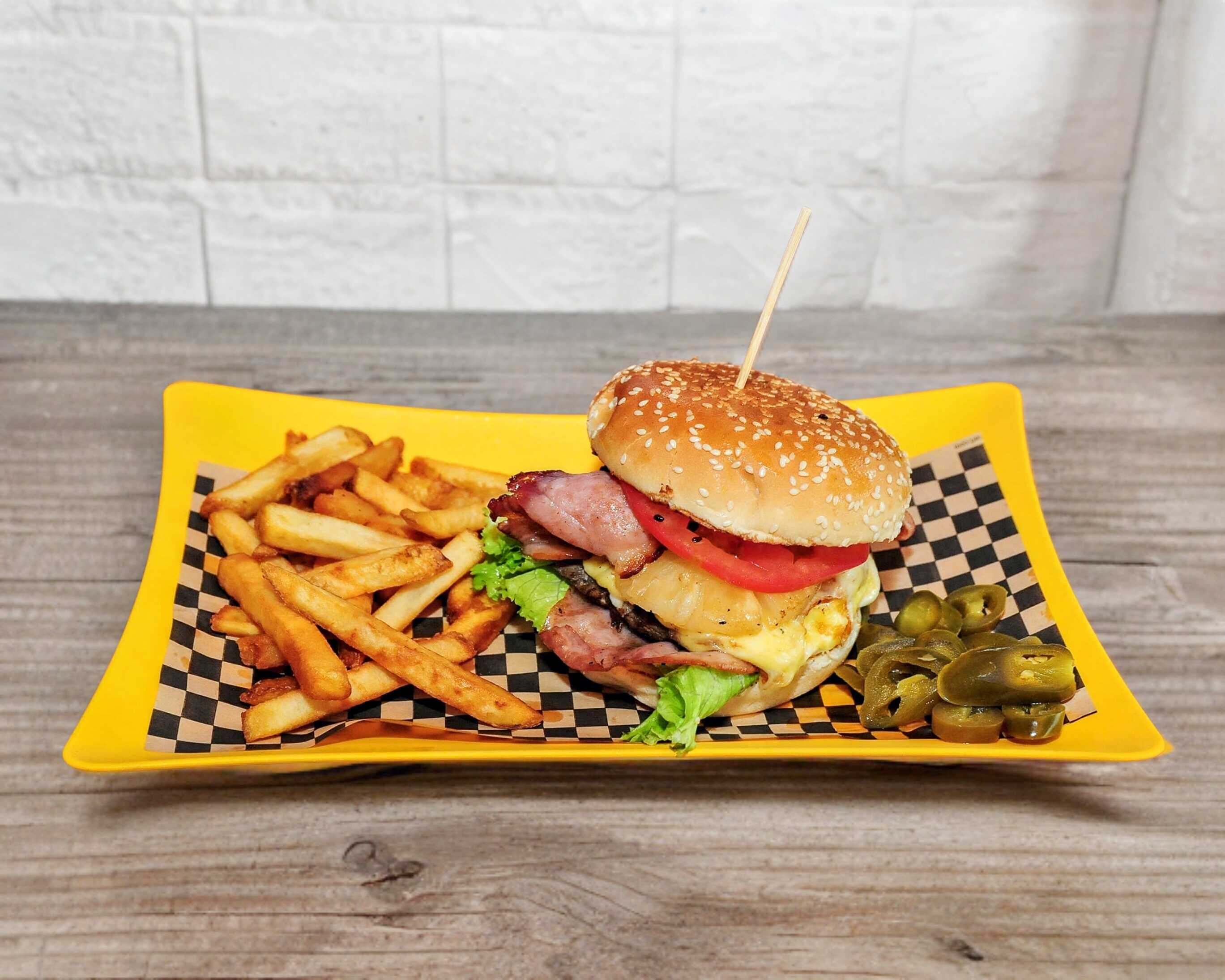 Carne de res, queso, tocino, jamón, piña, lechuga italiana, jitomate y cebolla, incluye papas a la francesa