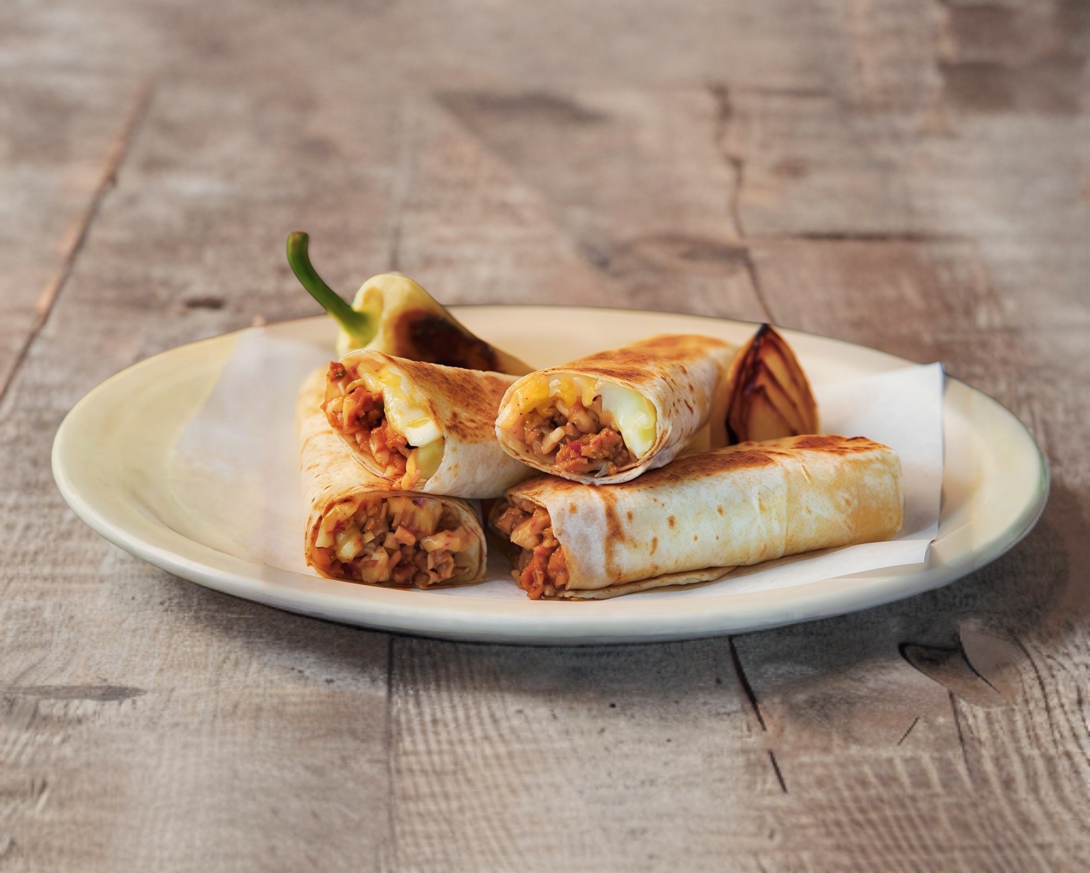 Arrachera, frijoles, queso, pimiento y cebolla.