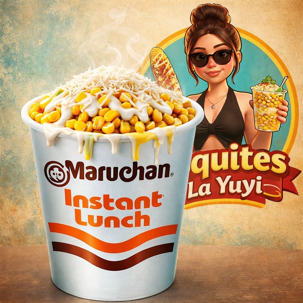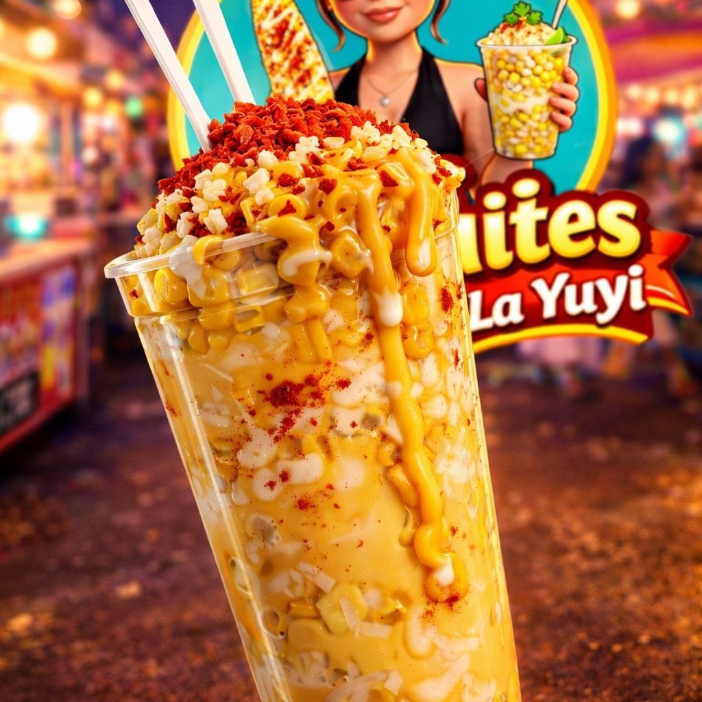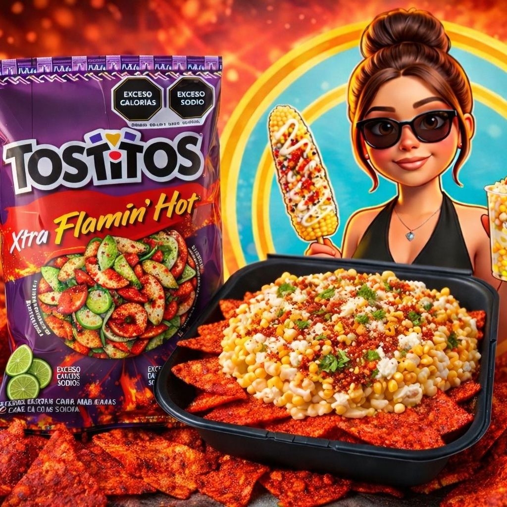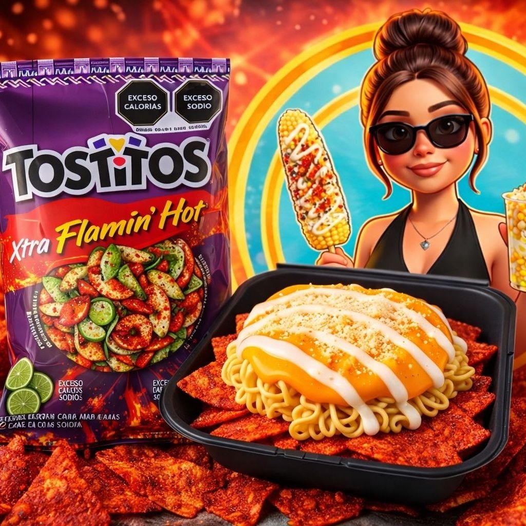 Vaso de 1LT, escarchado de queso amarillo, acompañado de Cheetos Flaming Hot, Maruchan y esquites
