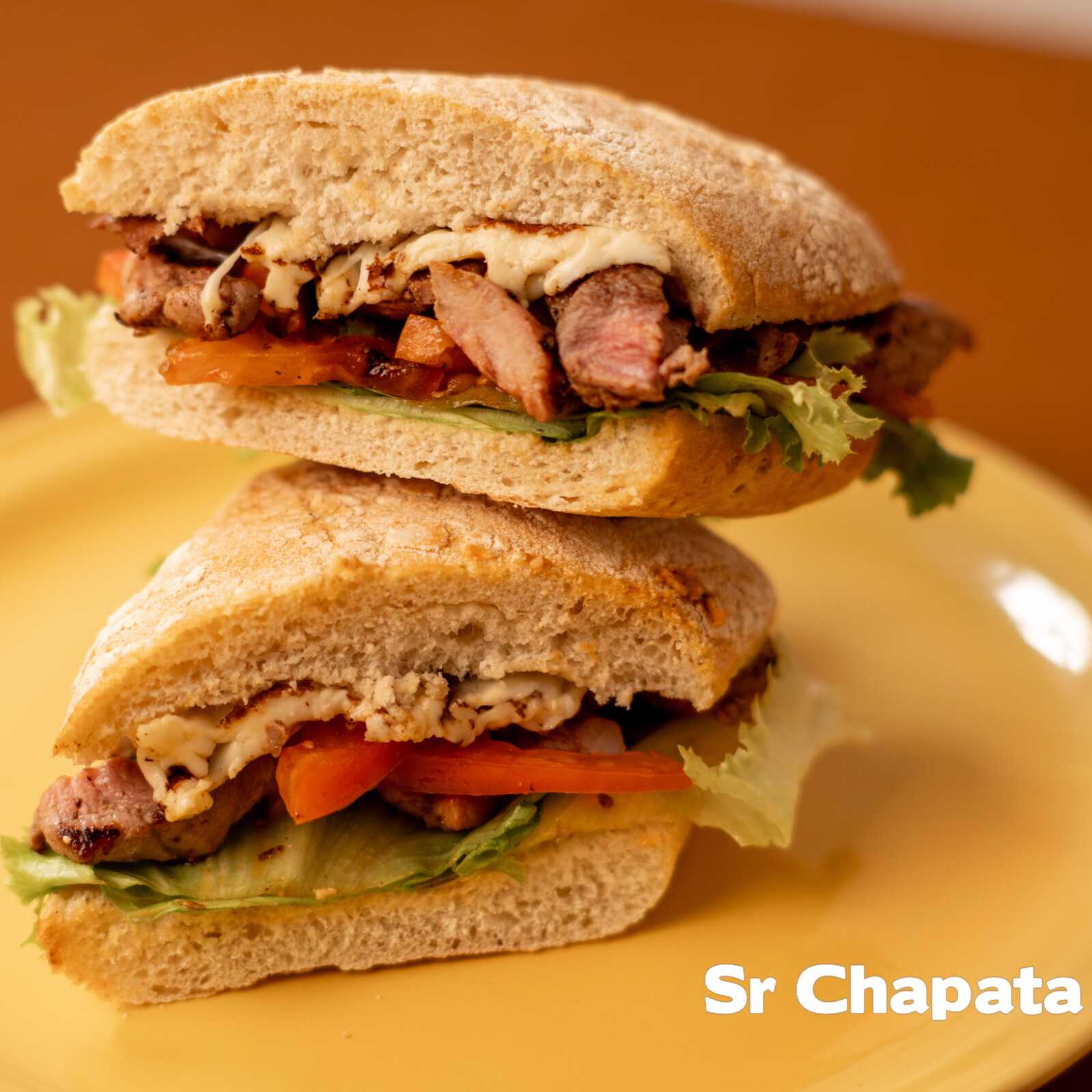 Chapata con pollo asado, pimientos, queso manchego, champiñones y mayonesa chipotle.