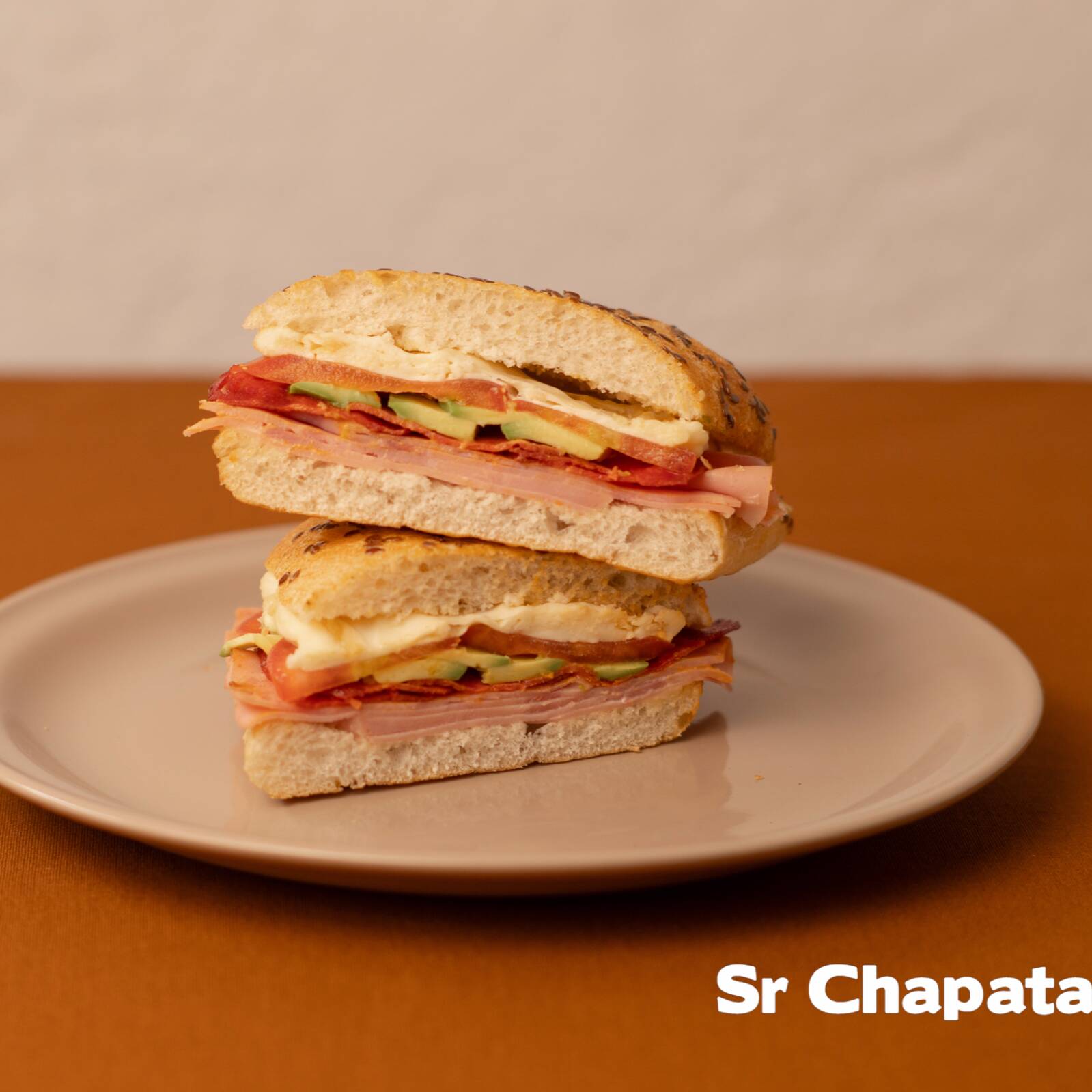 Chapata con jamón, pepperoni, queso manchego, jitomate, lechuga y mayonesa.