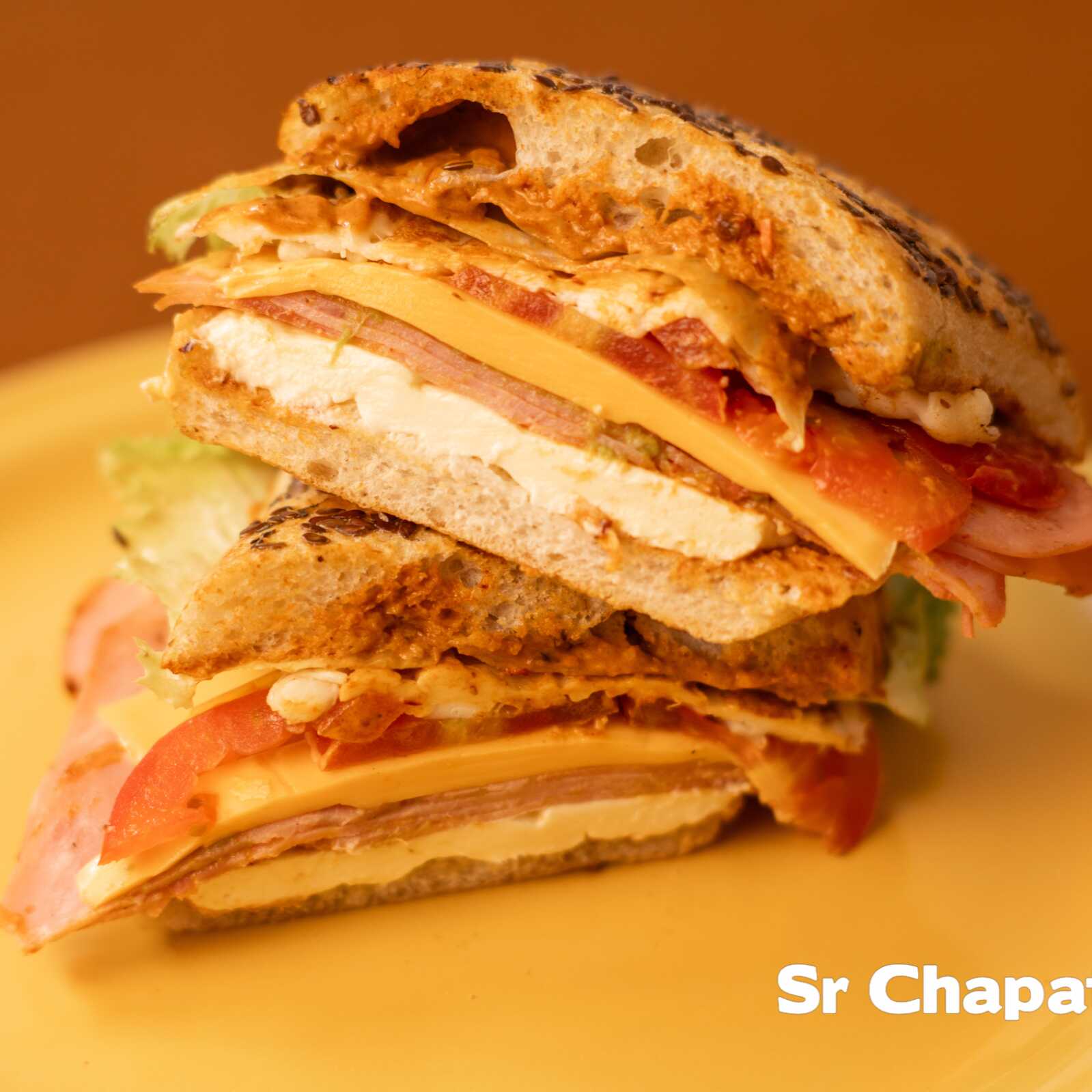 Chapata con queso manchego, queso philadelphia, queso americano, jamón, jitomate, lechuga y mayonesa chipotle.