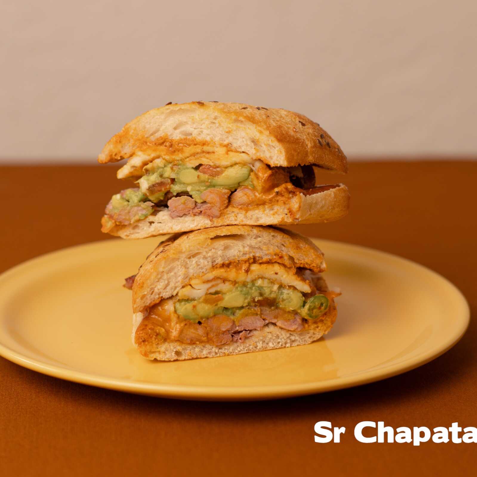 Chapata con jamón, lechuga, pepperoni, cebolla, jitomate, queso manchego, aguacate y salsa de tomate.
