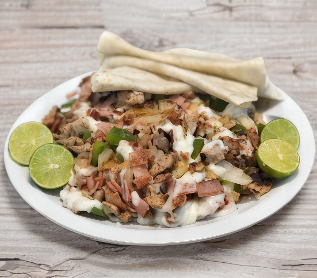 Pollo, jamón, tocino, morrón, cebolla, queso Oaxaca, 6Pzas tortillas de harina.