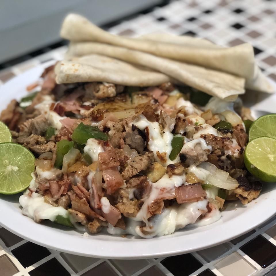 Bistec, jamón, tocino, morrón, cebolla, 6Pzaz de tortillas de harina.