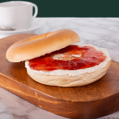 Pan tradicional denso con una cubierta exterior ligeramente crujiente acompañado por un cup de queso crema y con opción de mermelada de fresa o chabacano (497.9 kcal)