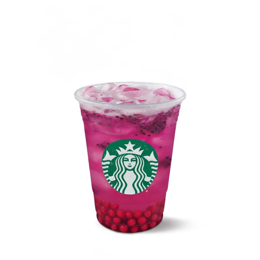 Nuestro exclusivo extracto de café verde mezclado con un refrescante concentrado de frutas, infusiones de pitahaya y hielo (grande 470 kcal), (venti 550 kcal).
