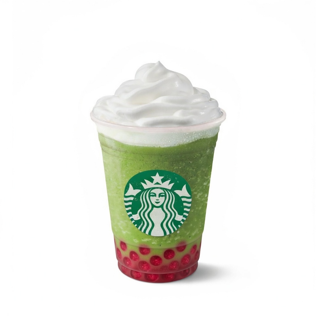 Frappuccino® base leche, mezclado con Té Matcha, un toque dulce y molido con hielo (grande 380 kcal), (venti 460 kcal).