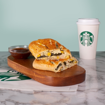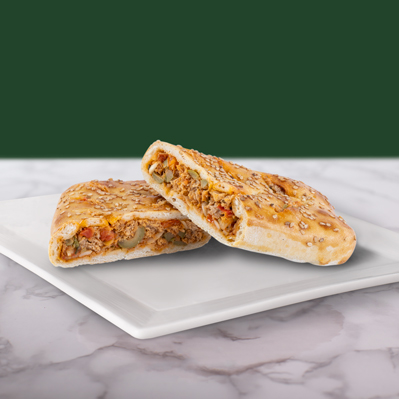 Pan relleno de rajas poblanas tatemadas con elote del huerto, queso crema y pollo, cubierta de queso parmesano (476 kcal)