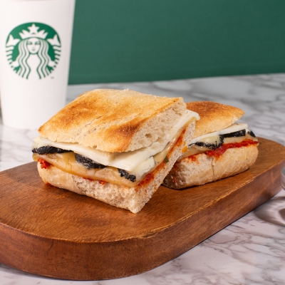 Sándwich elaborado con pan tipo ciabatta, queso tipo gouda, queso tipo mozarella, queso de cabra con cenizas y tomate deshidratado (697 kcal)