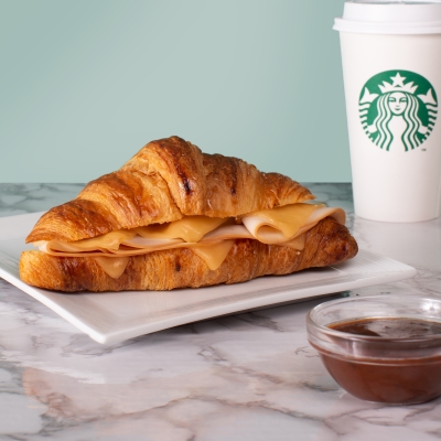 Disfruta de un café del día caliente o helado más un Croissant con Pechuga y Queso