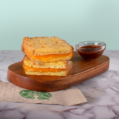 Pan de caja tipo brioche, queso mozarella, queso manchego y queso gouda, cubierto con una corteza de queso gratinado (470 kcal)