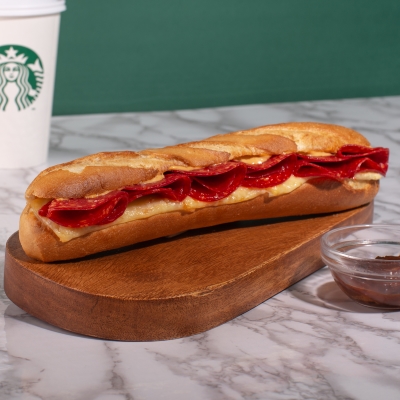Deliciosa baguette de Chorizo con queso gouda y aderezo cremoso de chipotle, ensamblada al momento en la que realizas tu orden (630 kcal)