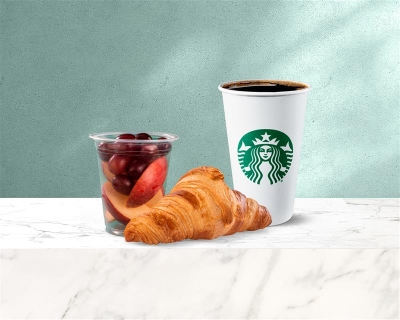 Disfruta de un café del día, un croissant mantequilla y un vaso de fruta a un precio especial