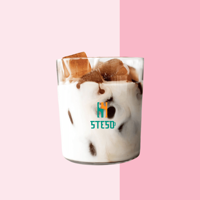 Bebida a base de café caliente, cacao oscuro y leche vaporizada, con una capa encima de espuma de leche sabor cacao. Con cubos de hielo en el interior.