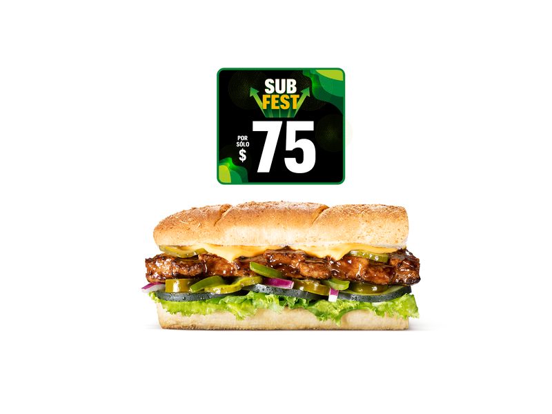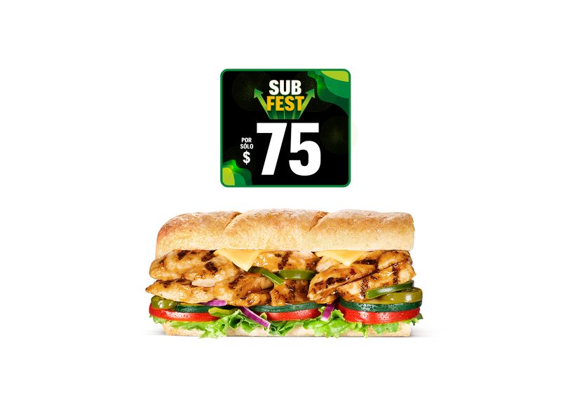 Pan integral con tiras de pechuga de pollo estilo teriyaki, doble porción de queso americano, cebollitas crujientes, lechuga, jitomates, pimientos verdes y aderezo de cebolla dulce, más papas o galleta y bebida.