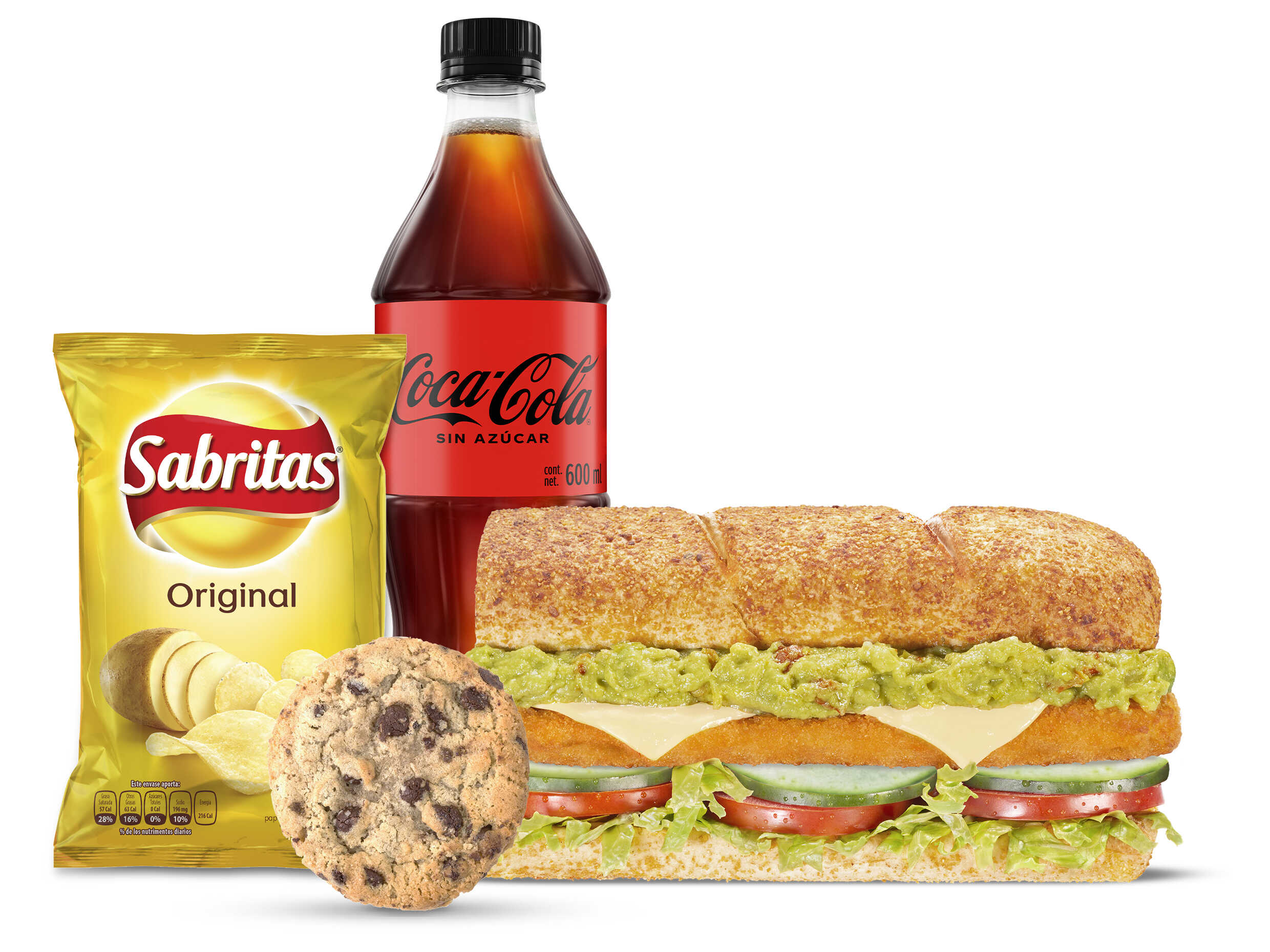Pan integral con tiras de pechuga de pollo estilo teriyaki, doble porción de queso americano, cebollitas crujientes, lechuga, jitomates, pimientos verdes y aderezo de cebolla dulce, más papas o galleta y bebida.