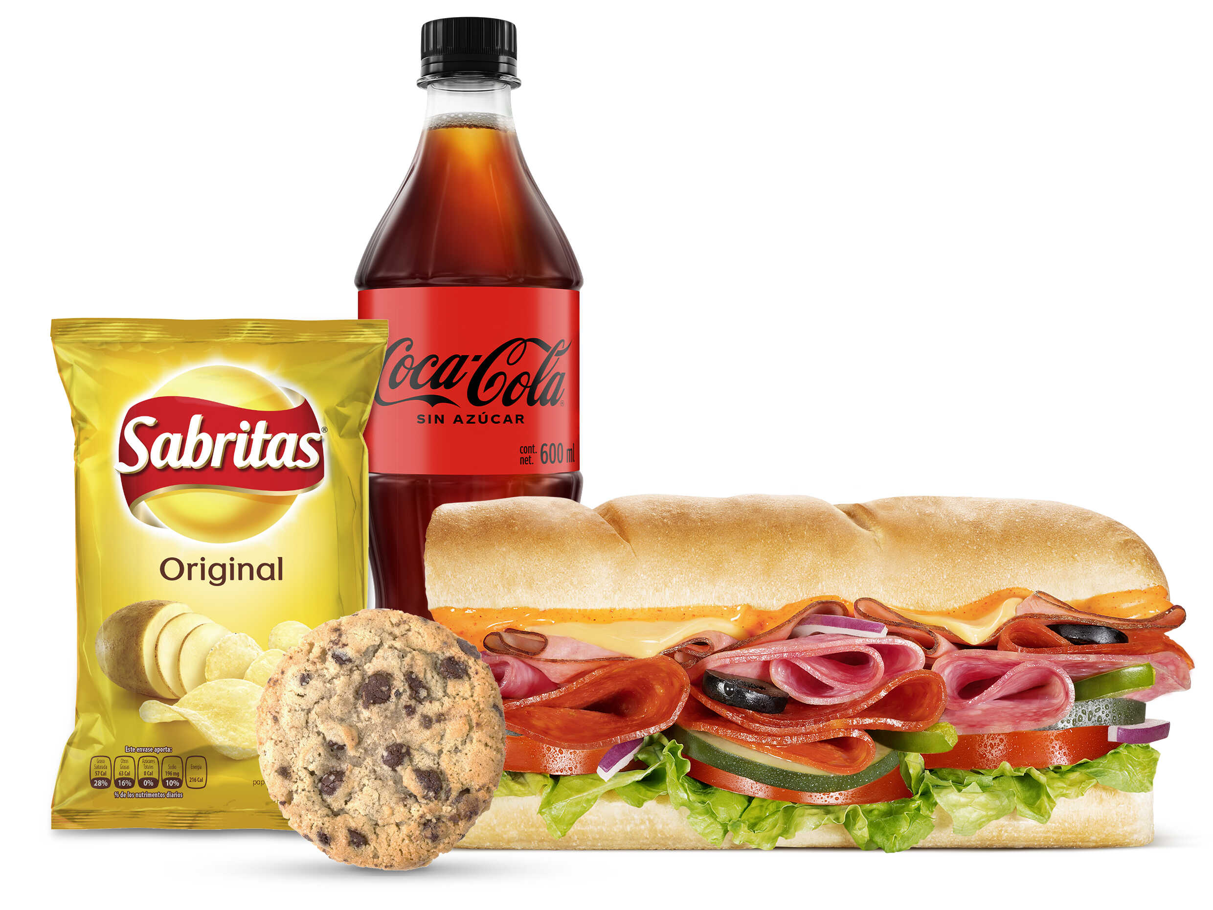 Rebanadas de salami, pepperoni y jamón de cerdo, con el queso y vegetales de tu elección, más papas, galleta y bebida.