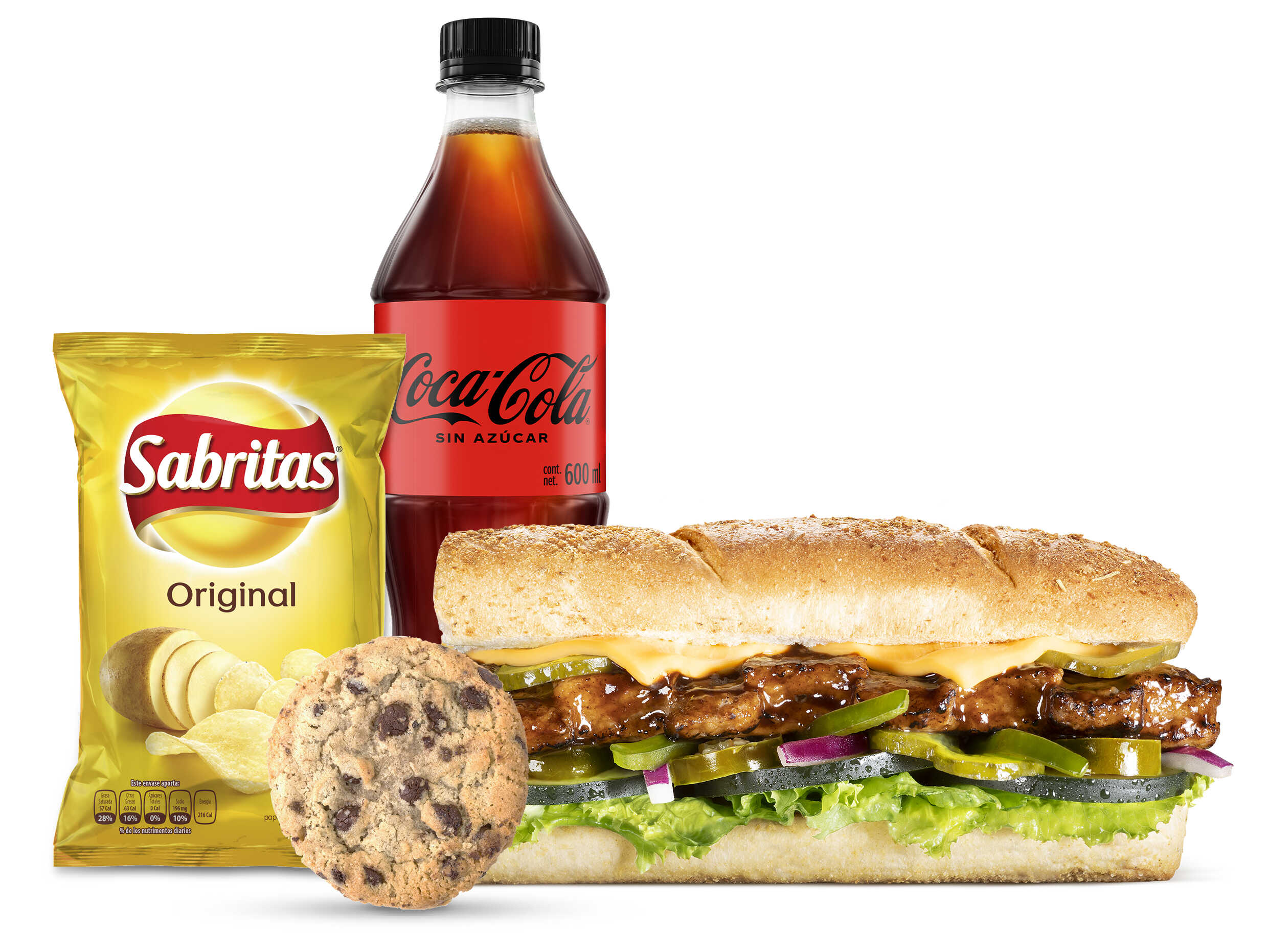 Pan integral con tiras de pechuga de pollo estilo teriyaki, doble porción de queso americano, cebollitas crujientes, lechuga, jitomates, pimientos verdes y aderezo de cebolla dulce, más papas o galleta y bebida.