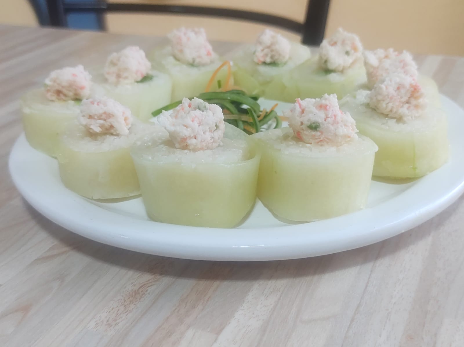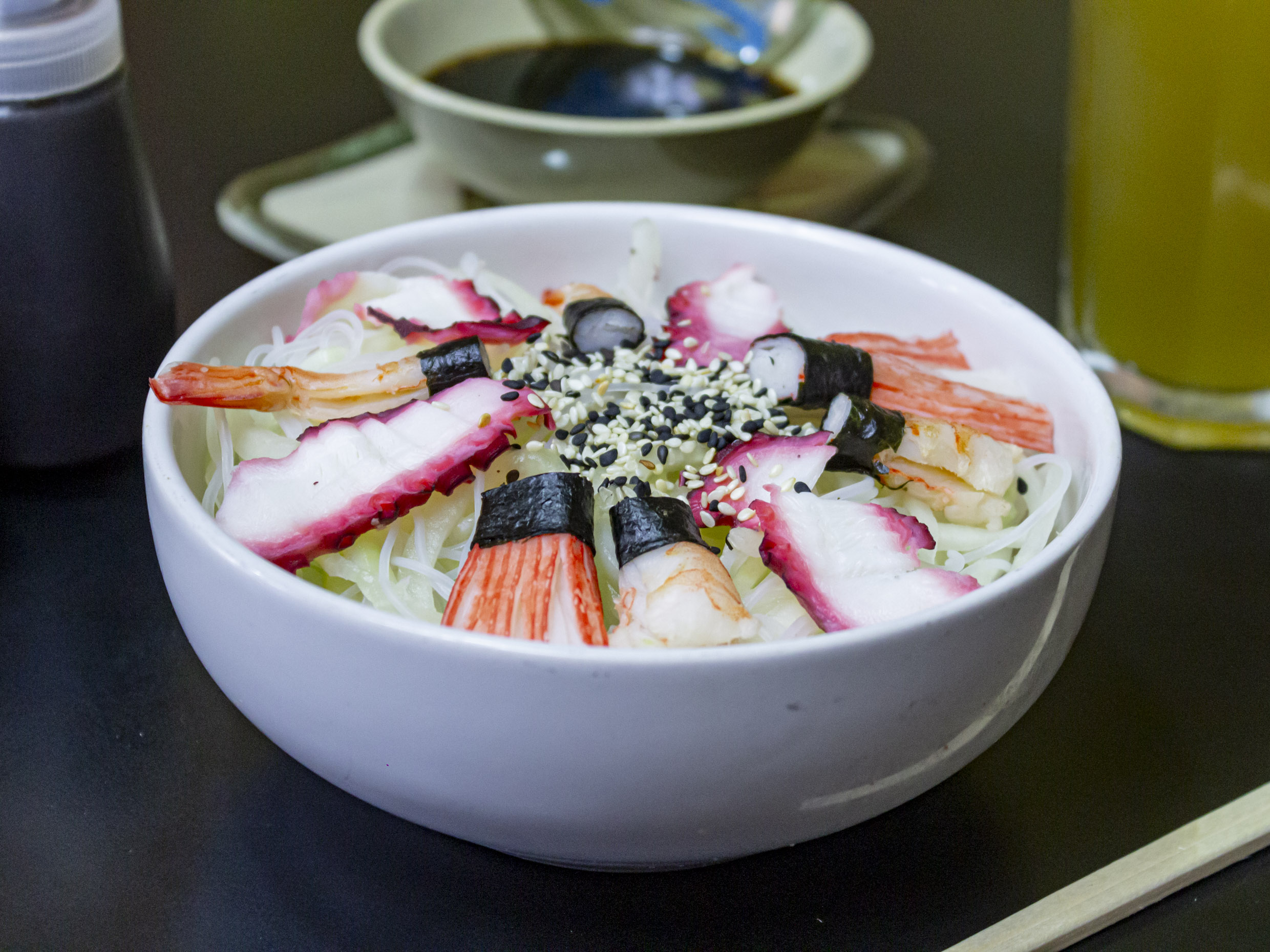 170grs Camarón, pulpo y kanikama con pepino y fideo harusamme y aderezo de vinagre de arroz y Ajonjolí