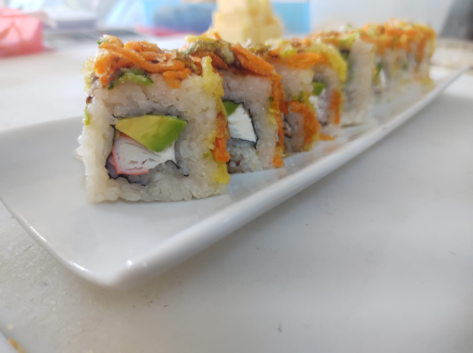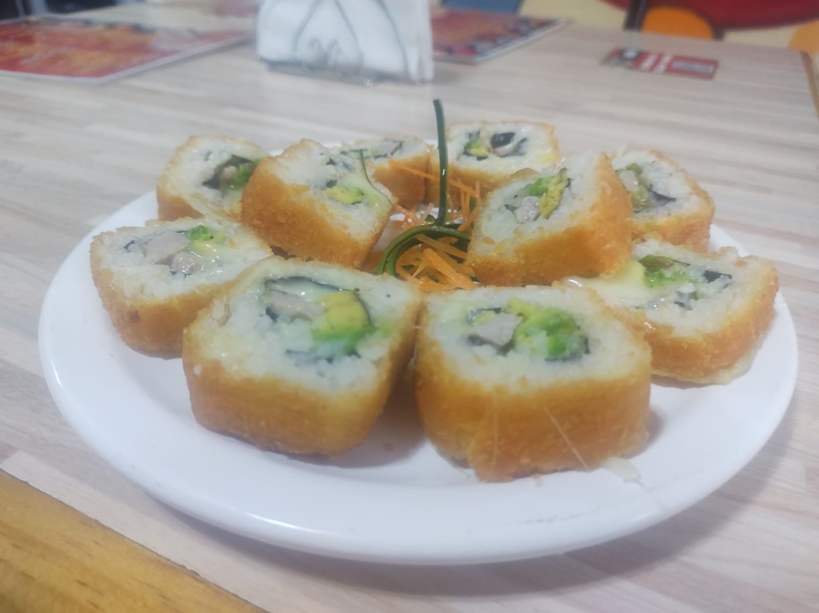 10pz XF: Alga Nori XD: Queso Philadelphia, aguacate, pepino, camarón empanizado y salsa de chipotle