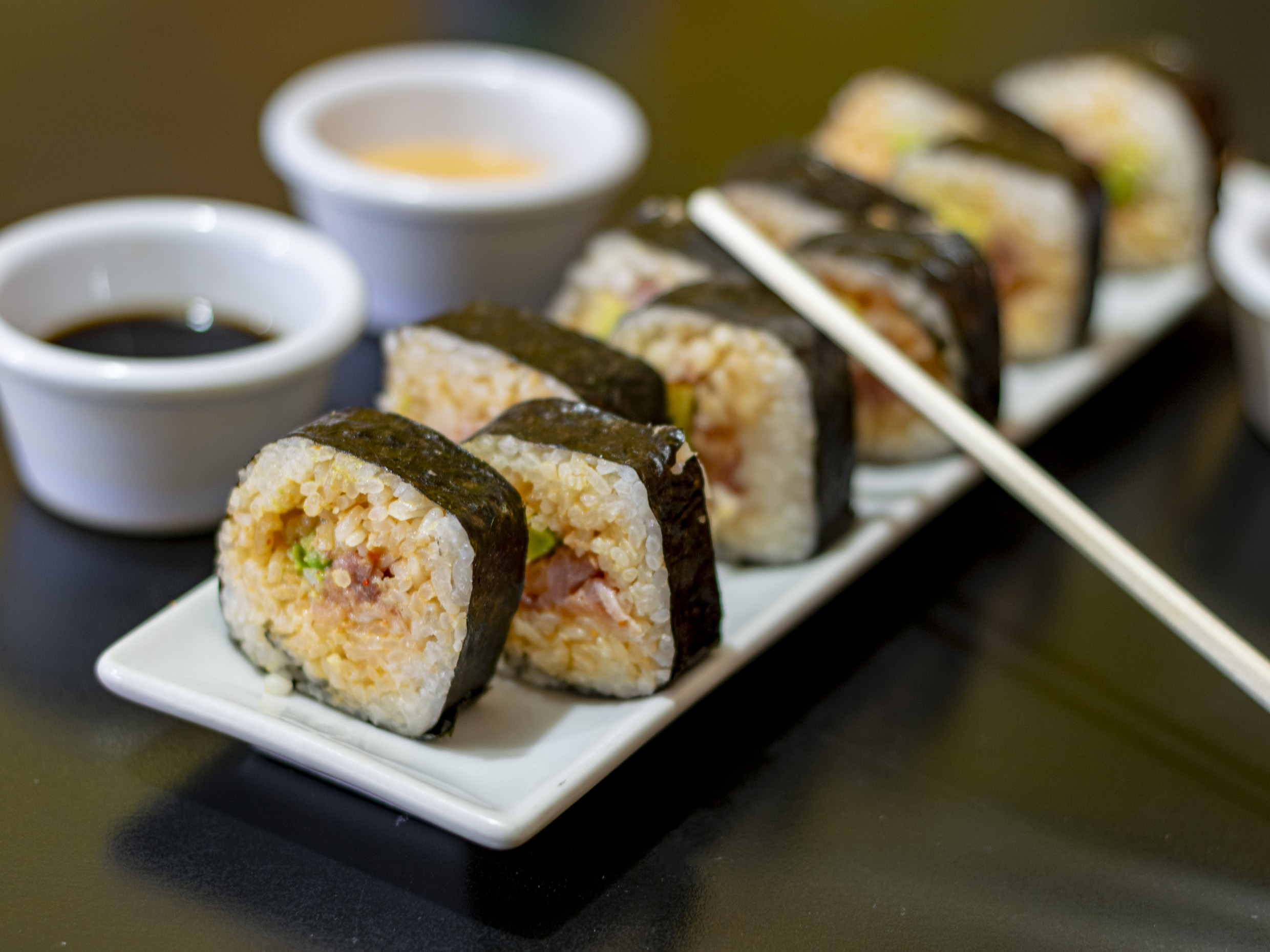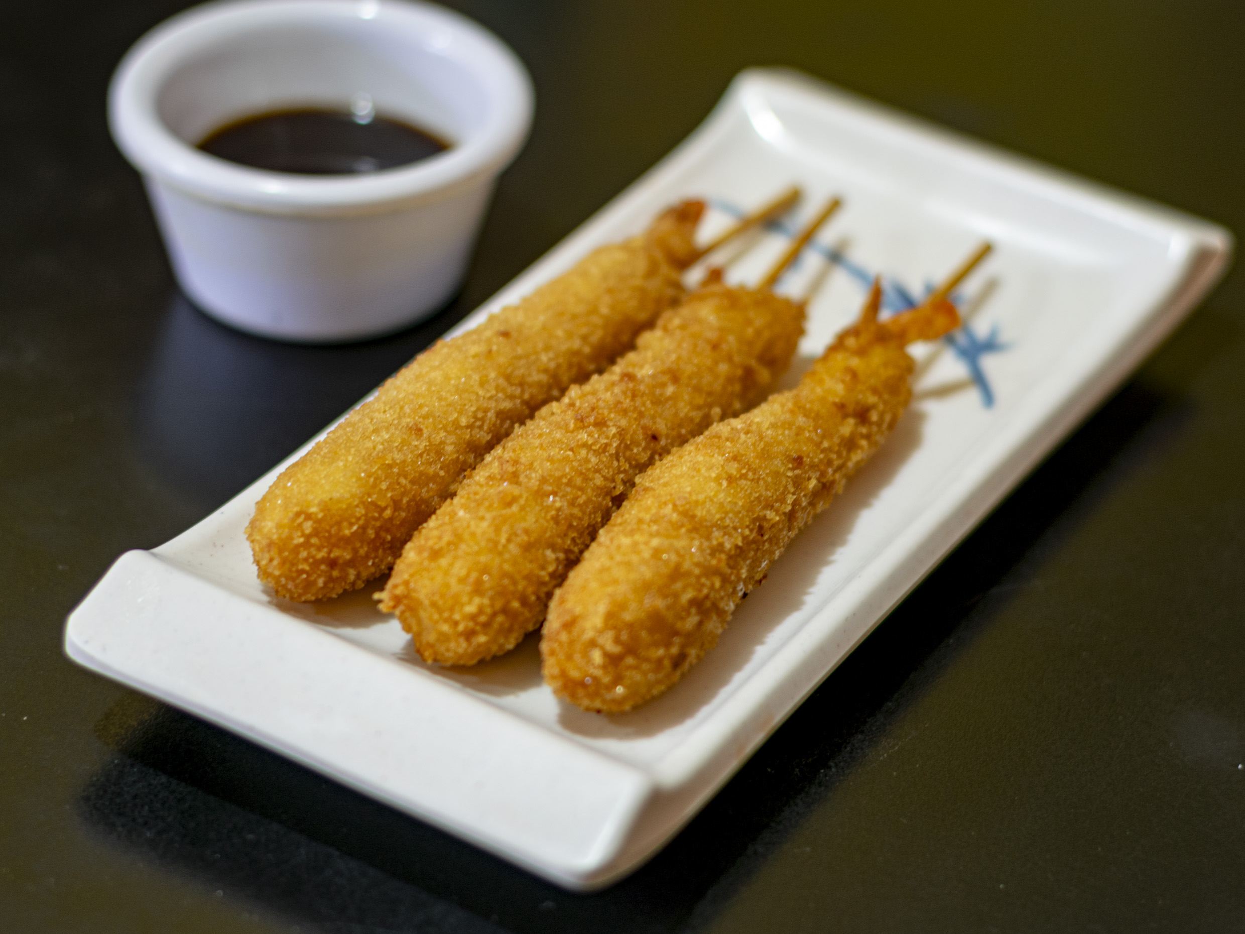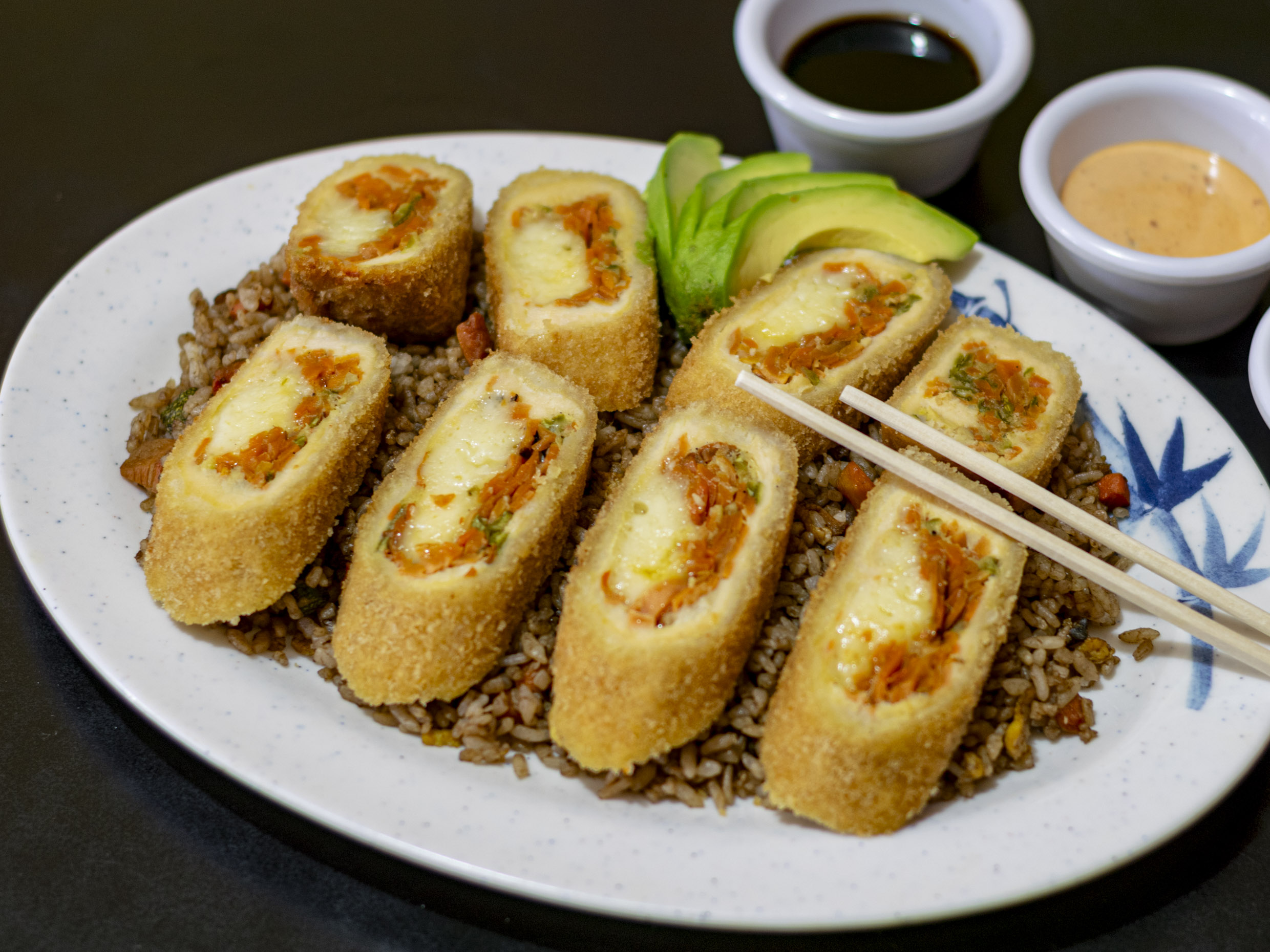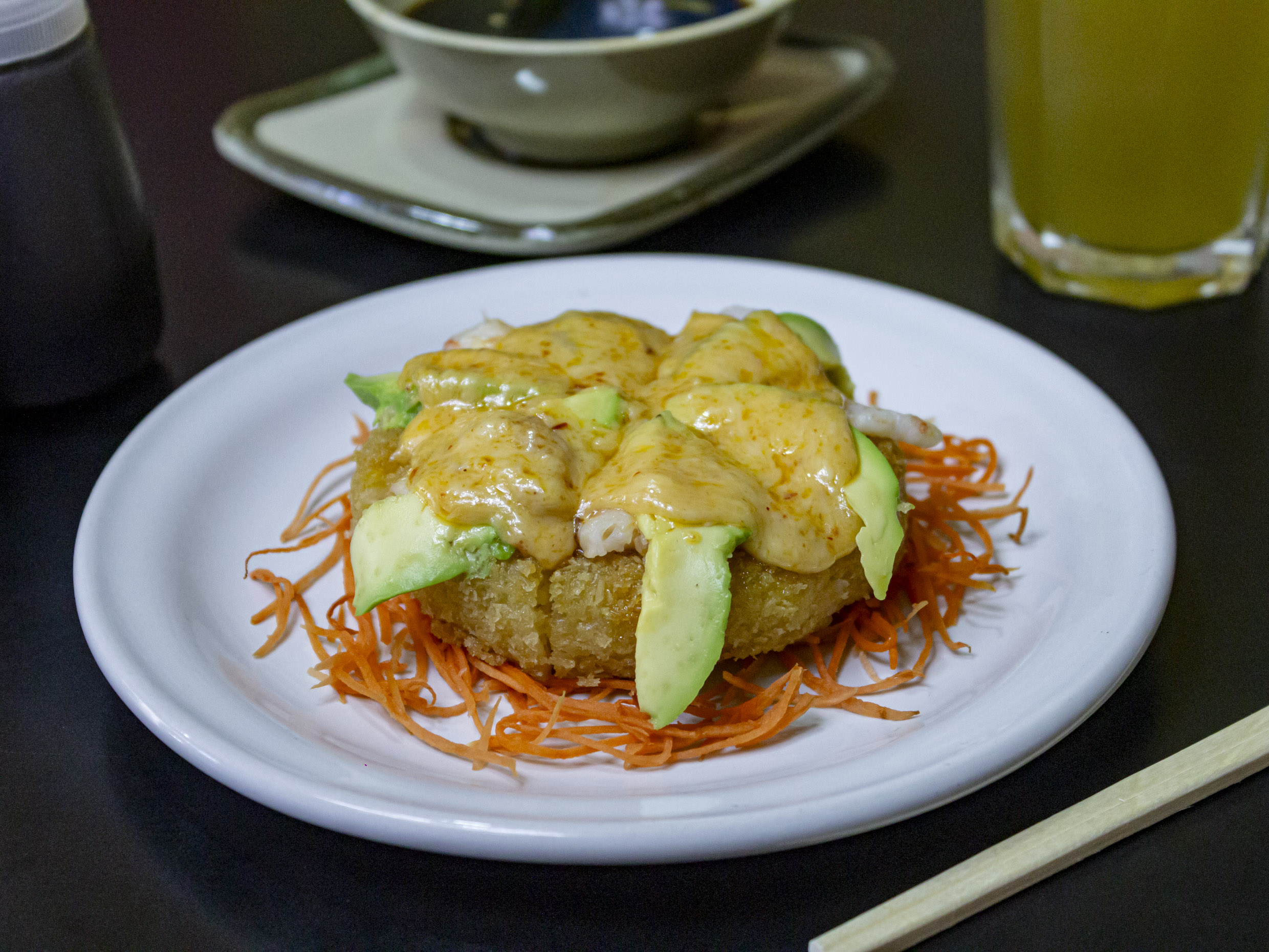 200grs 1 Bola de arroz empanizada rellena de queso Philadelphia, queso manchego, aguacate, camarón y salsa Tampico.