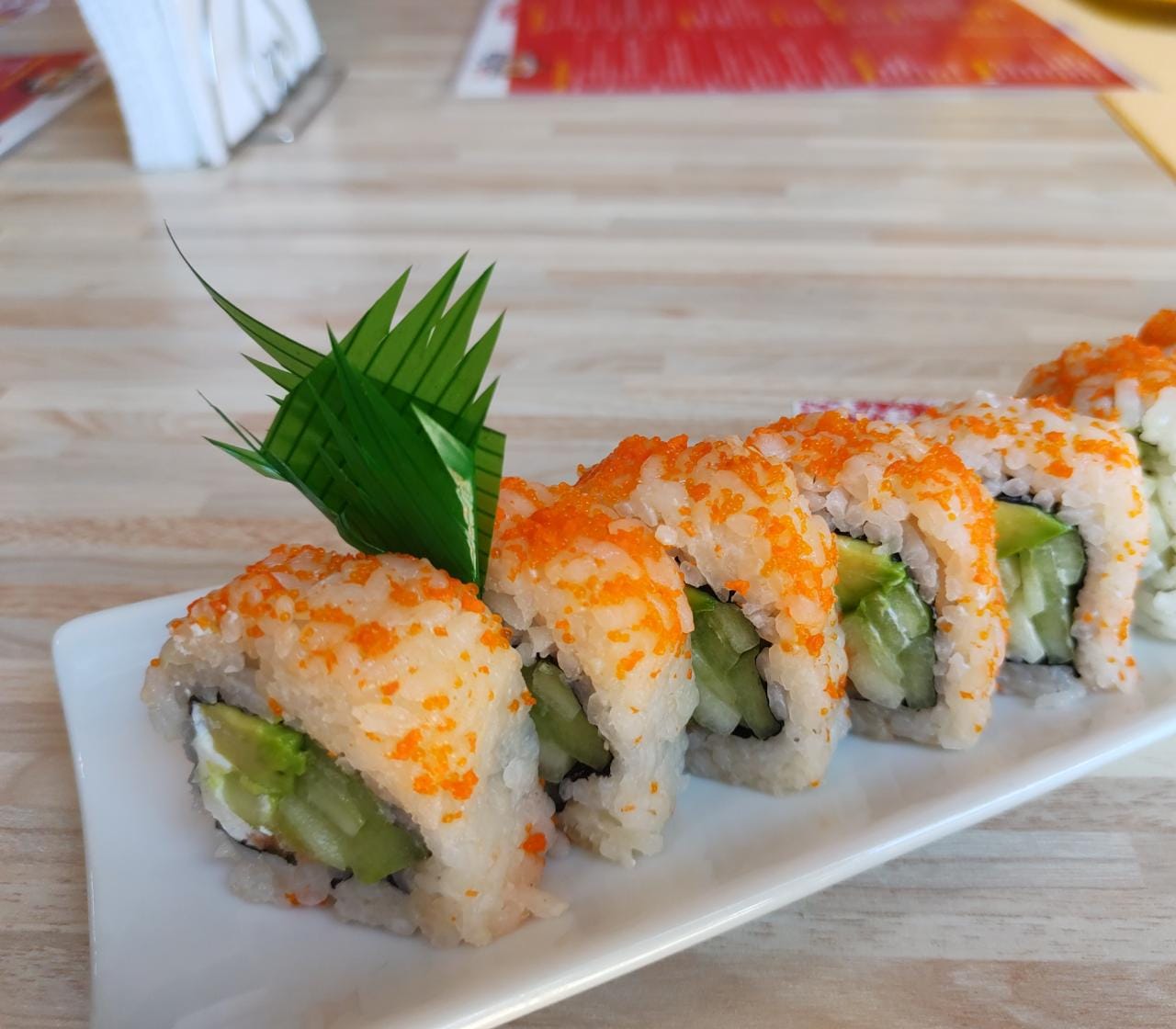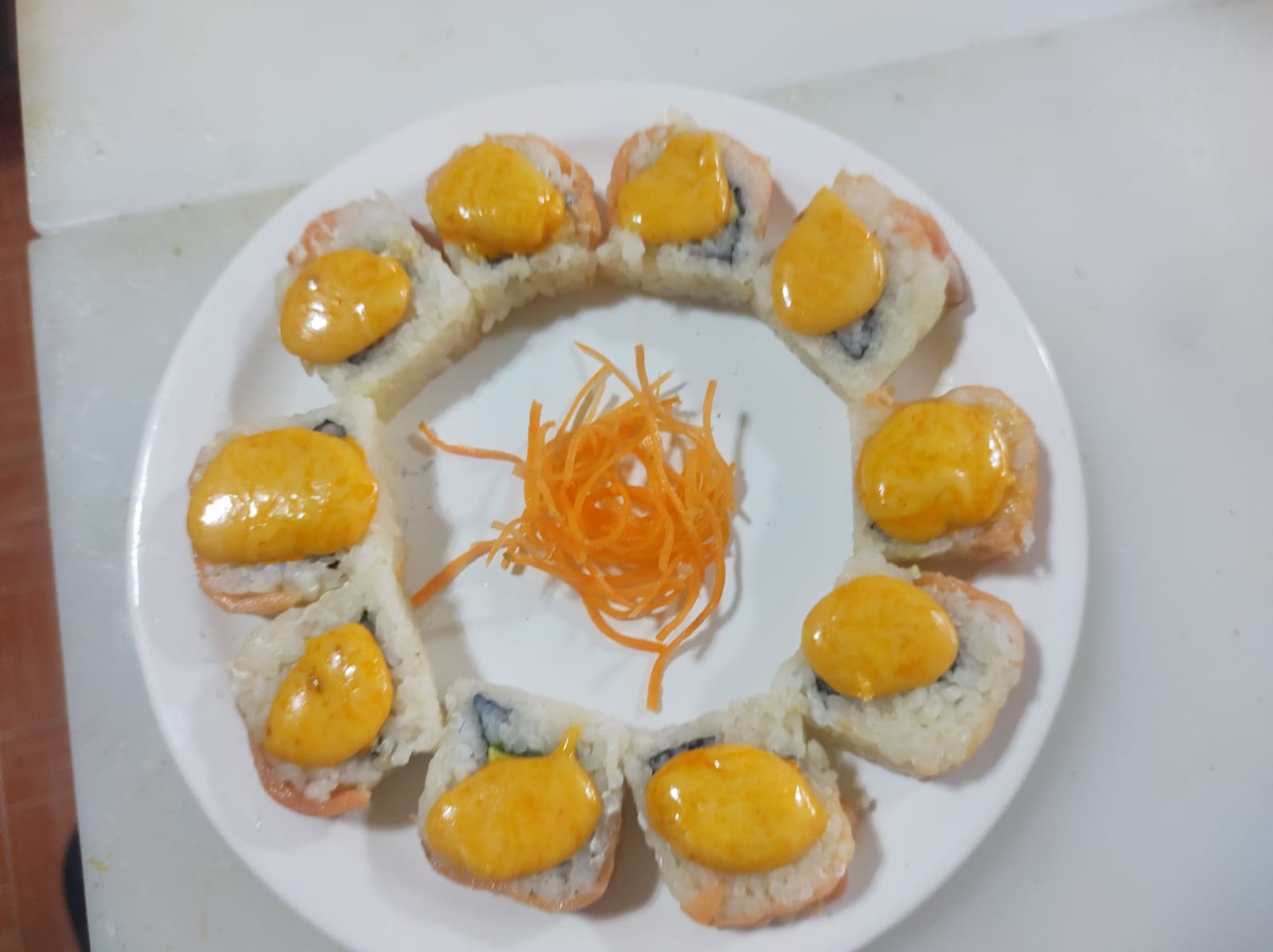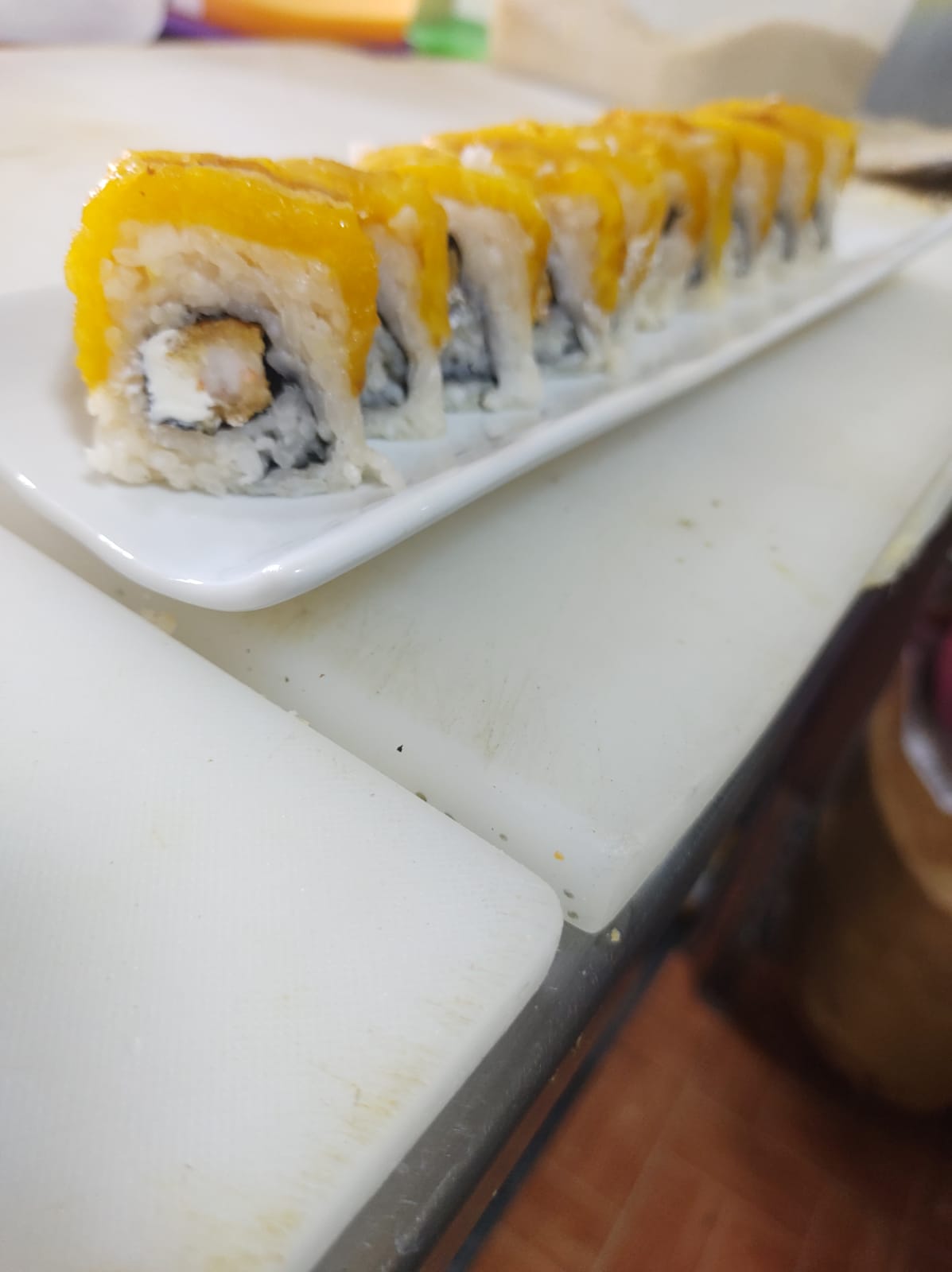 California Especial (con masago), cortado en 10 piezas. Por fuera masago y por dentro queso Philadelphia, aguacate y pepino, con proteína a elección (camarón, salmón, kanikama, pulpo o atún).