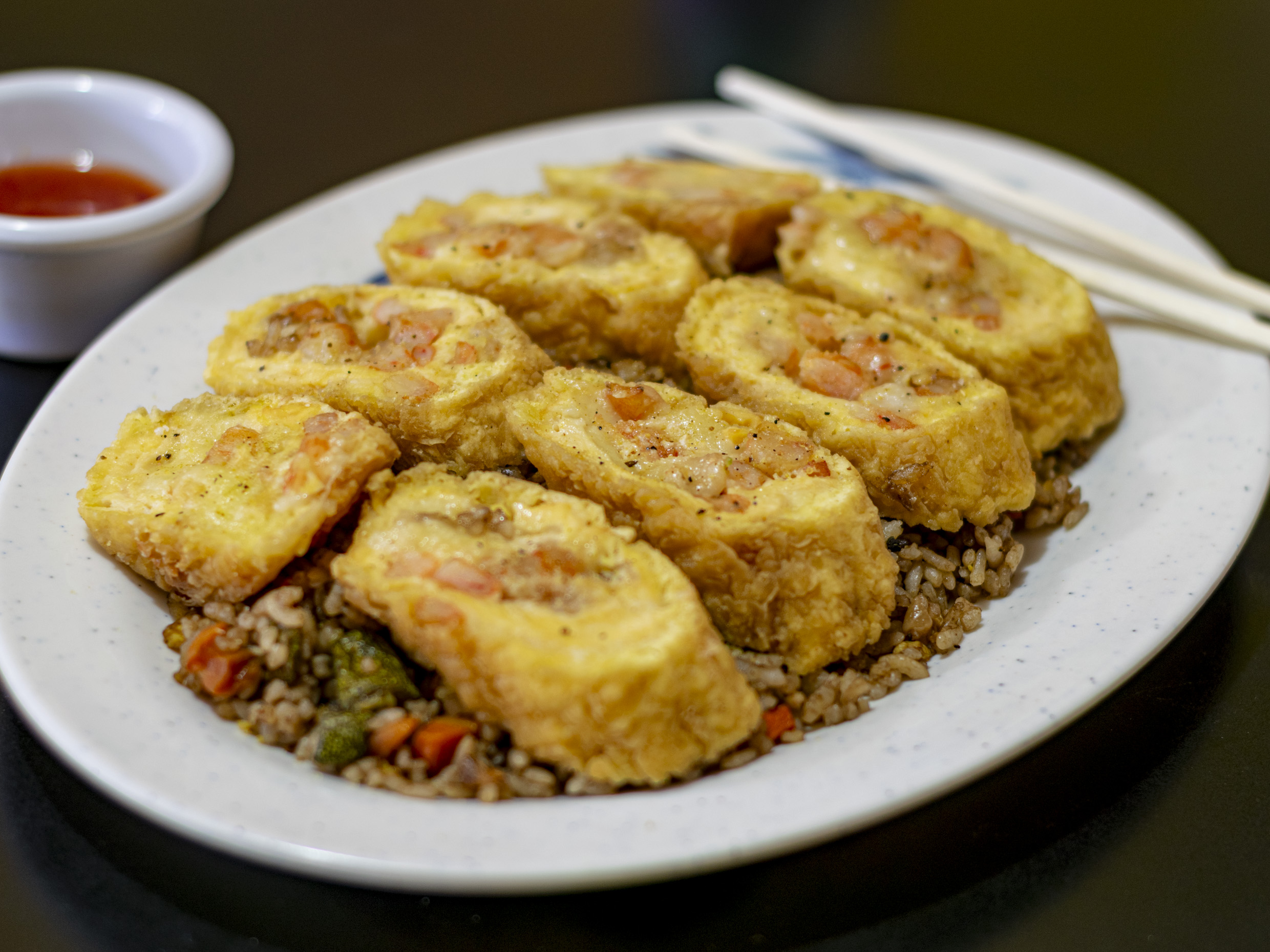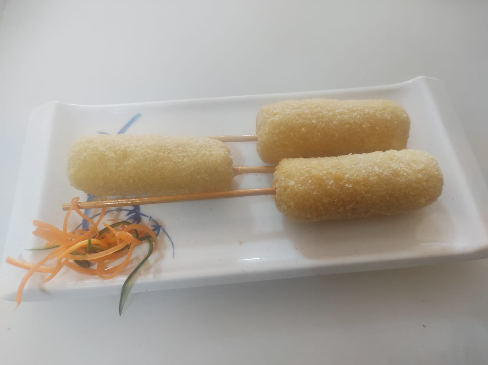 Banana Roll (10 piezas), por fuera plátano frito y por dentro queso Philadelphia y camarón empanizado.