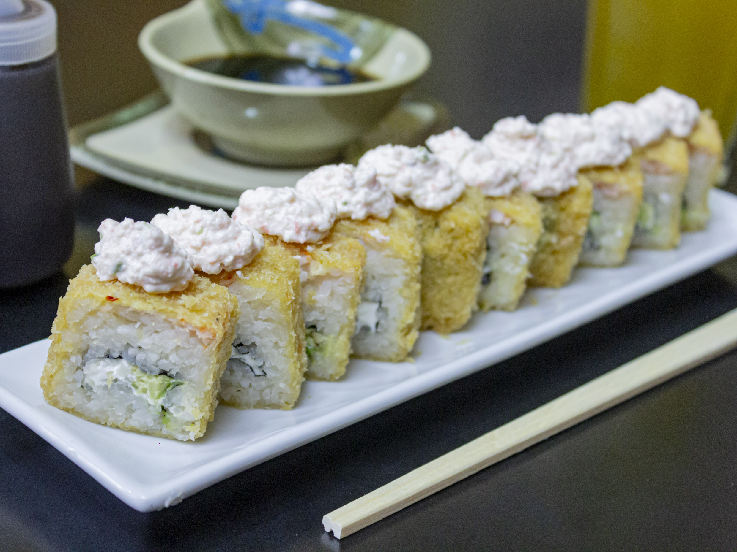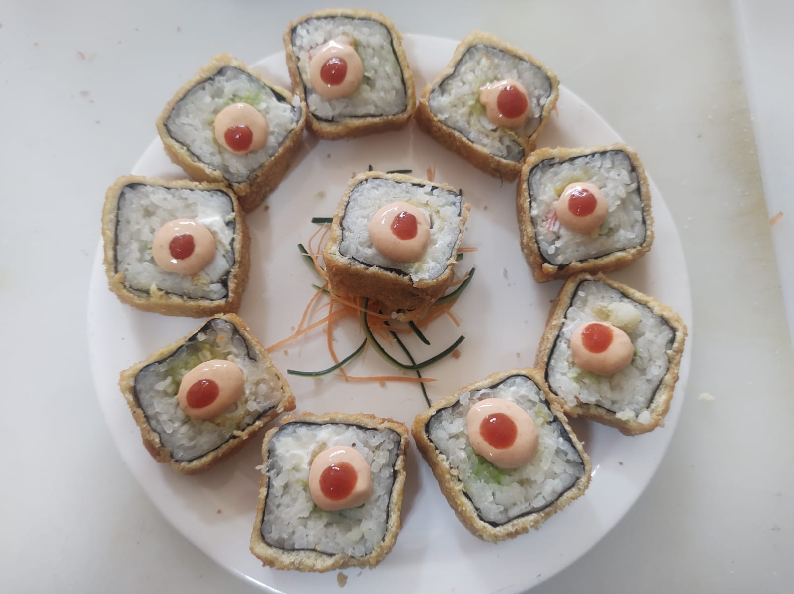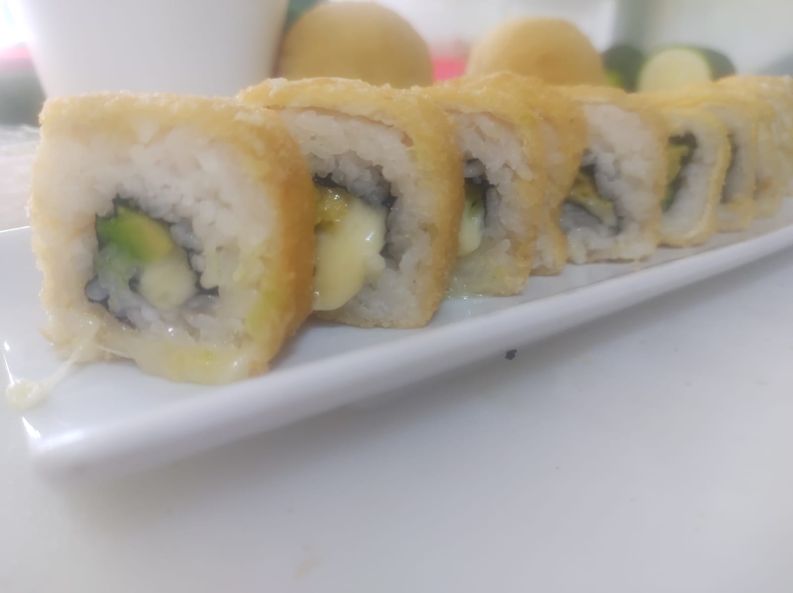10pz XF : Empanizado XD: Surimi, aguacate y queso Philadelphia con salsa chipotle y shiracha.