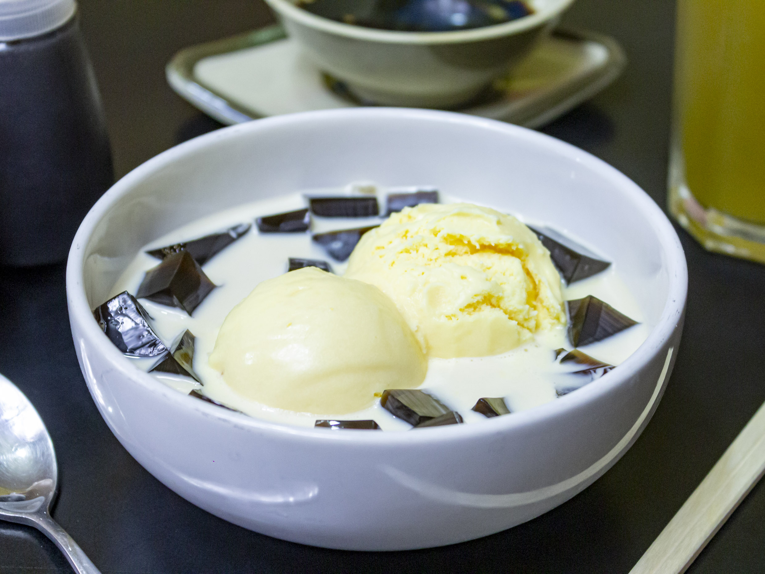 250ml Gelatina de café con kalua preparada con 2 bolas de helado vainilla.