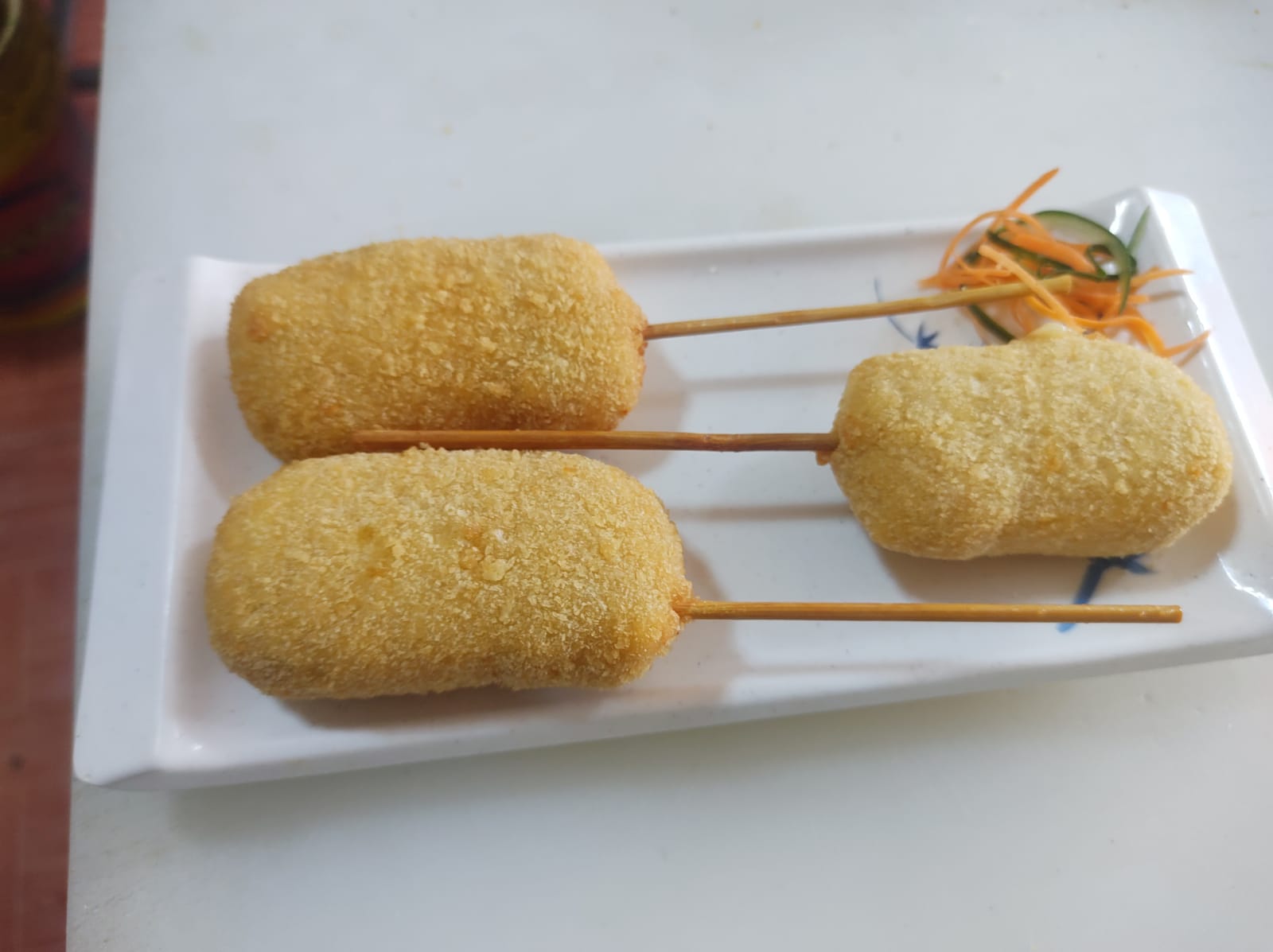 10pz XF: Queso manchego con chiles toreados, XD: Kakiage, aguacate y surimi