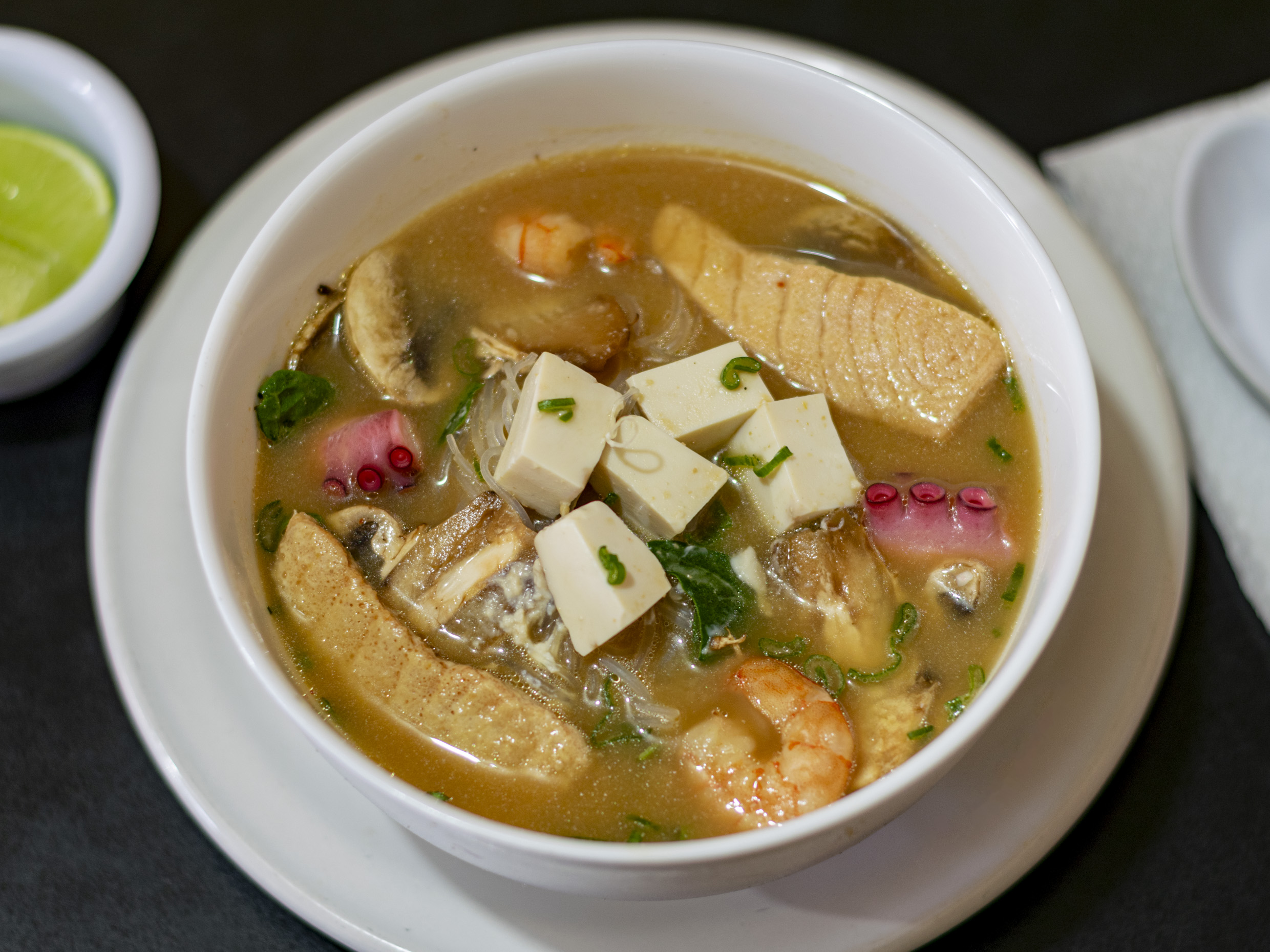 32oz Camarón, pulpo, pescado, fideo harusame, espinaca, champiñón y tofu
