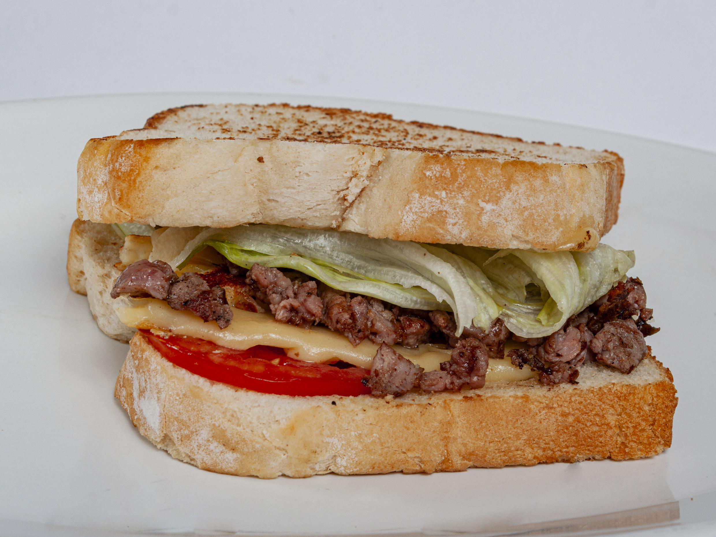 Arrachera, queso manchego, jitomate, lechuga, mayonesa.