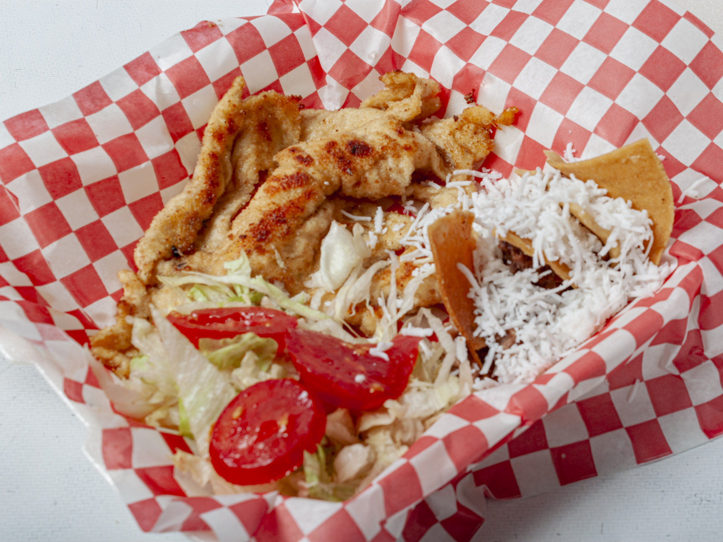 Arrachera, queso manchego, jitomate, lechuga y salsa de tomate.
