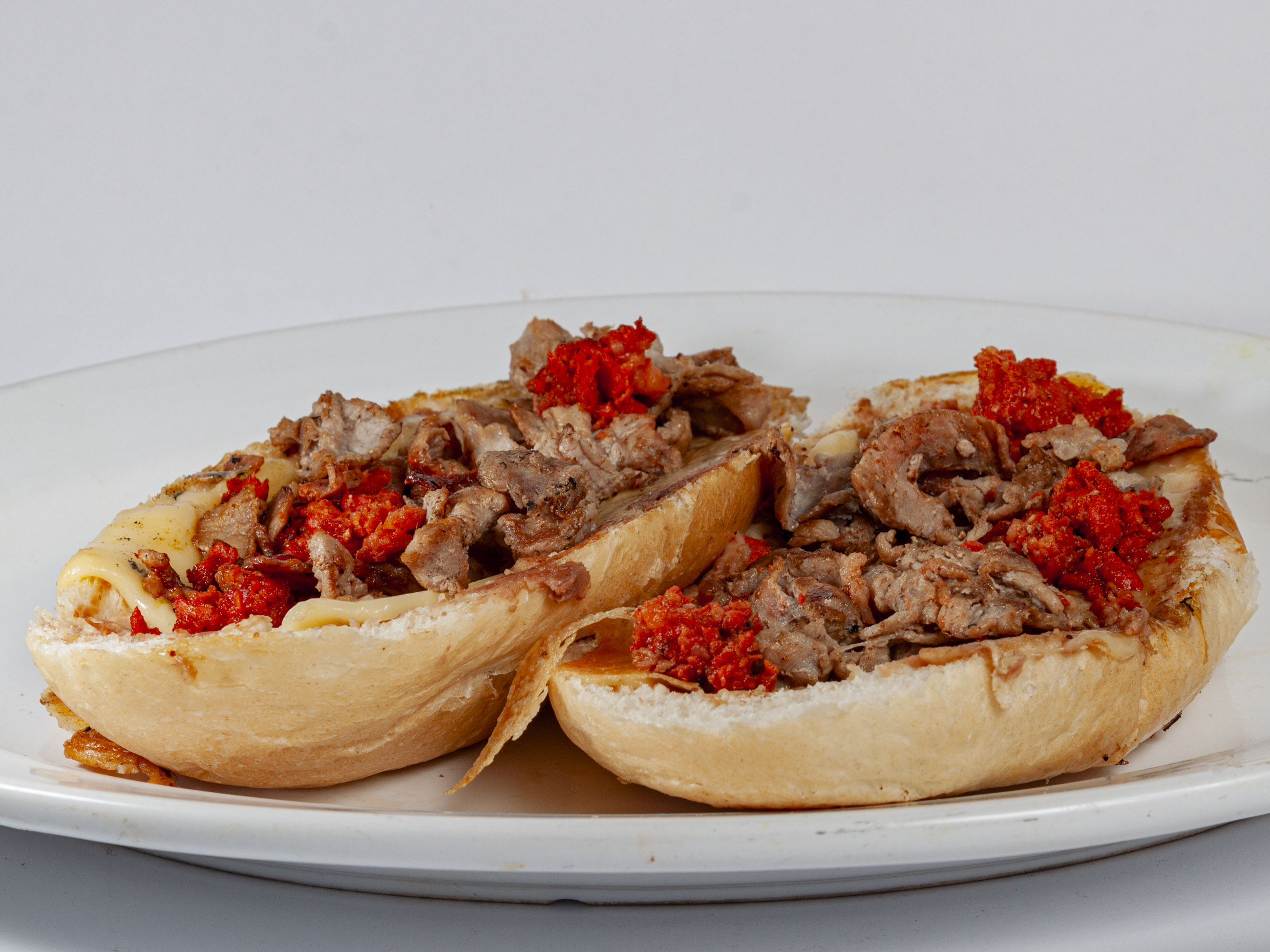 Orden de 2 molletes con bistec y longaniza, preparados con frijoles queso gratinado y pico de gallo