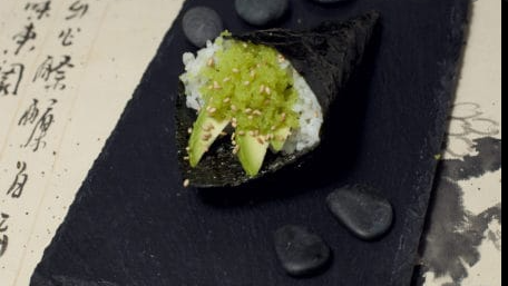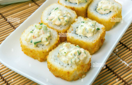 Por fuera ajonjolí, por dentro queso, pepino y aguacate.