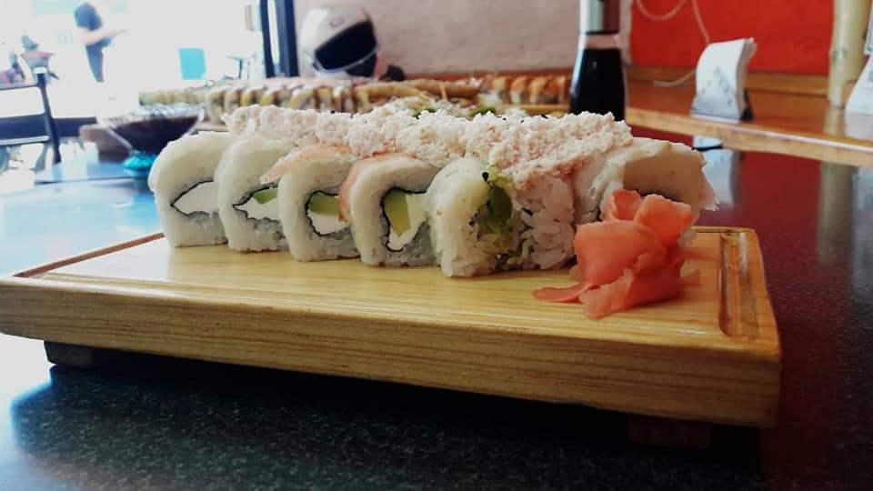 Ebi Roll: 10 piezas envueltas en camarón; rellenas de queso, pepino y aguacate, con tampico encima