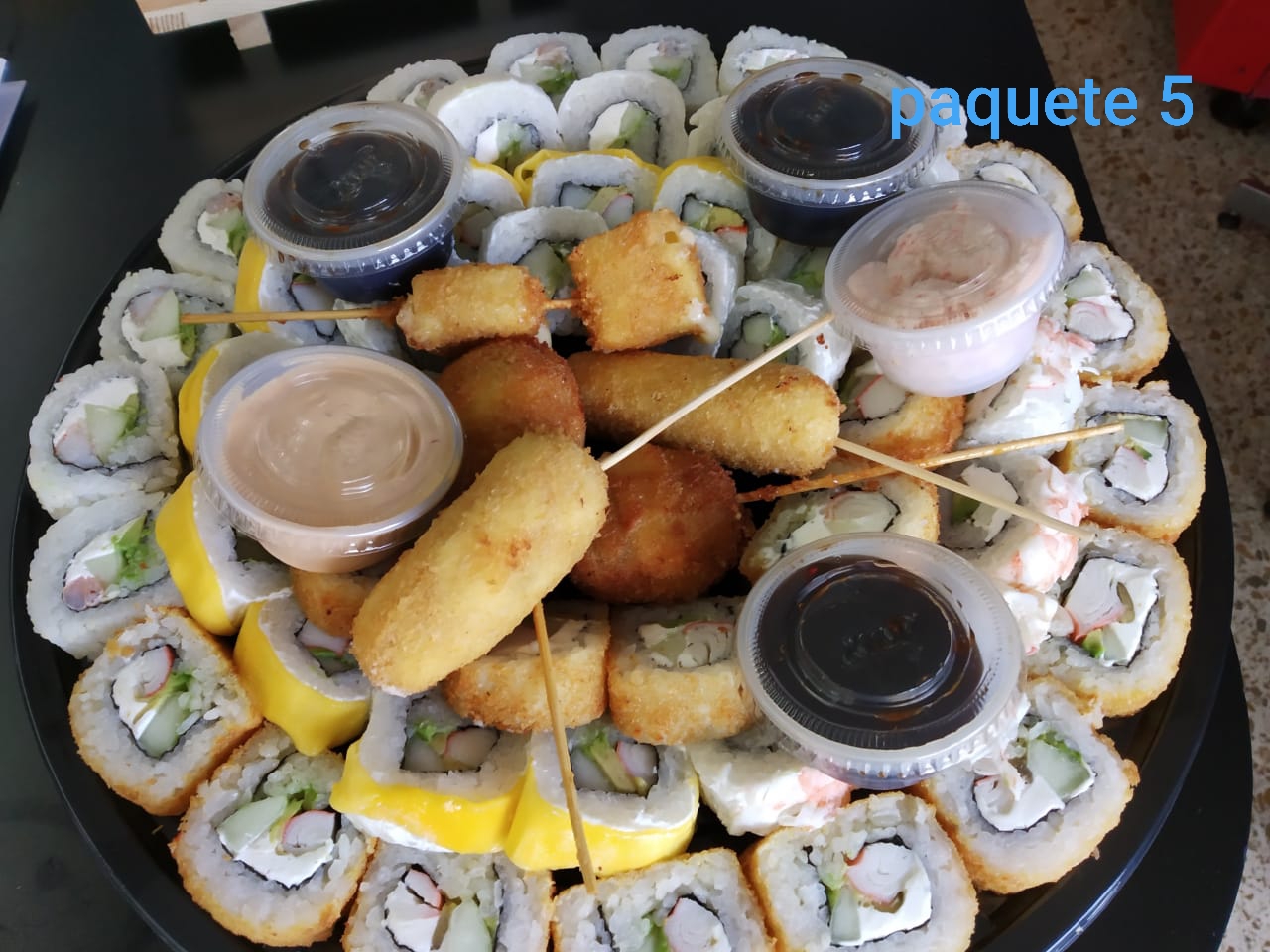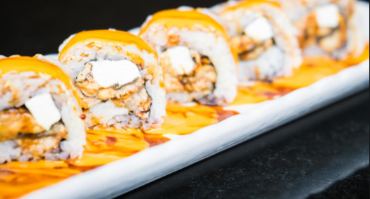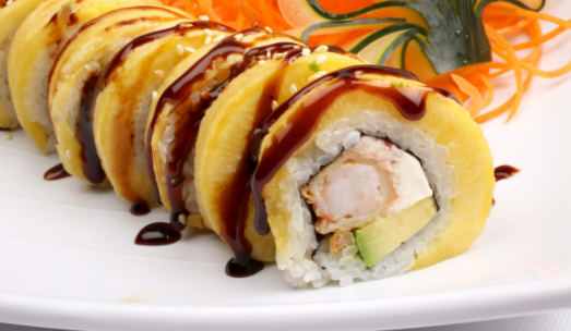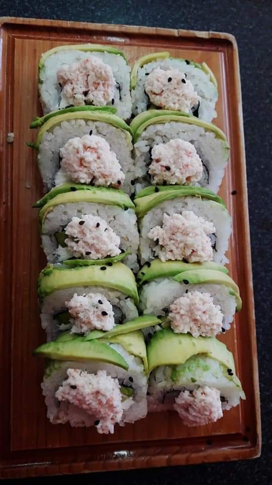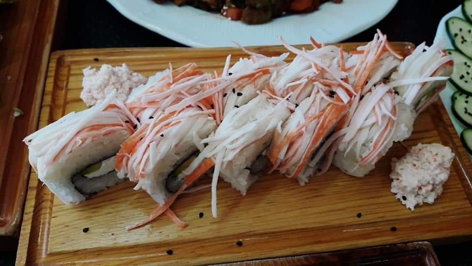 Con alga por fuera, por dentro queso, pepino, aguacate, cangrejo, salmón, masago y encima salsa dulce.